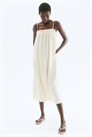 Расклешенное платье длиной до щиколоток из мягкого хлопкового муслина. Свободный крой с узкими регулируемыми бретелями и прямым вырезом с оборкой и двумя рядами узкой эластичной резинки. Без подкладки.