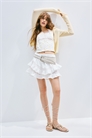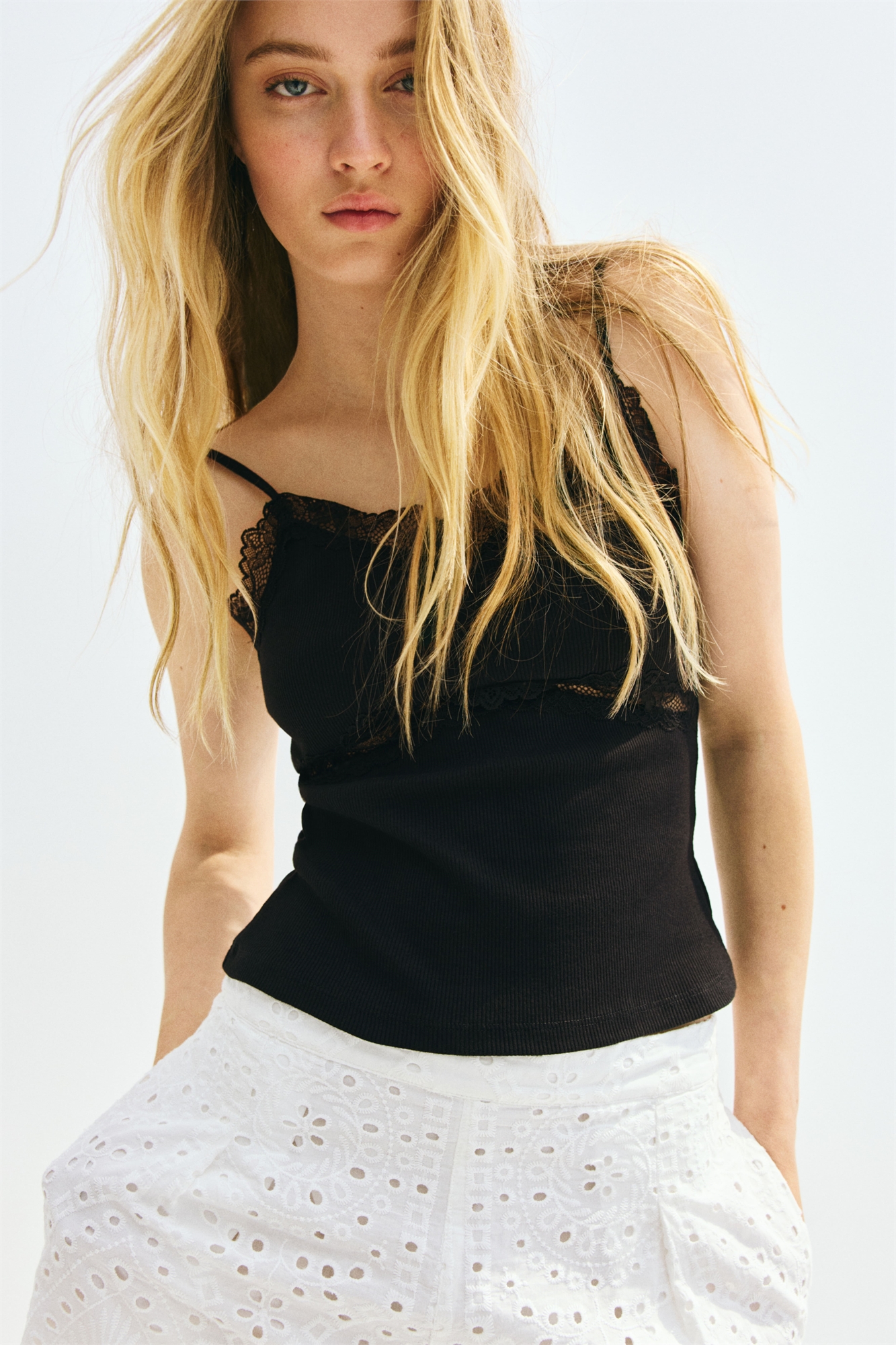 Облегающий топ из ребристого хлопкового джерси с кружевной отделкой в верхней части и под бюстом. V-образный вырез, рюши по центру бюста и регулируемые узкие бретели.