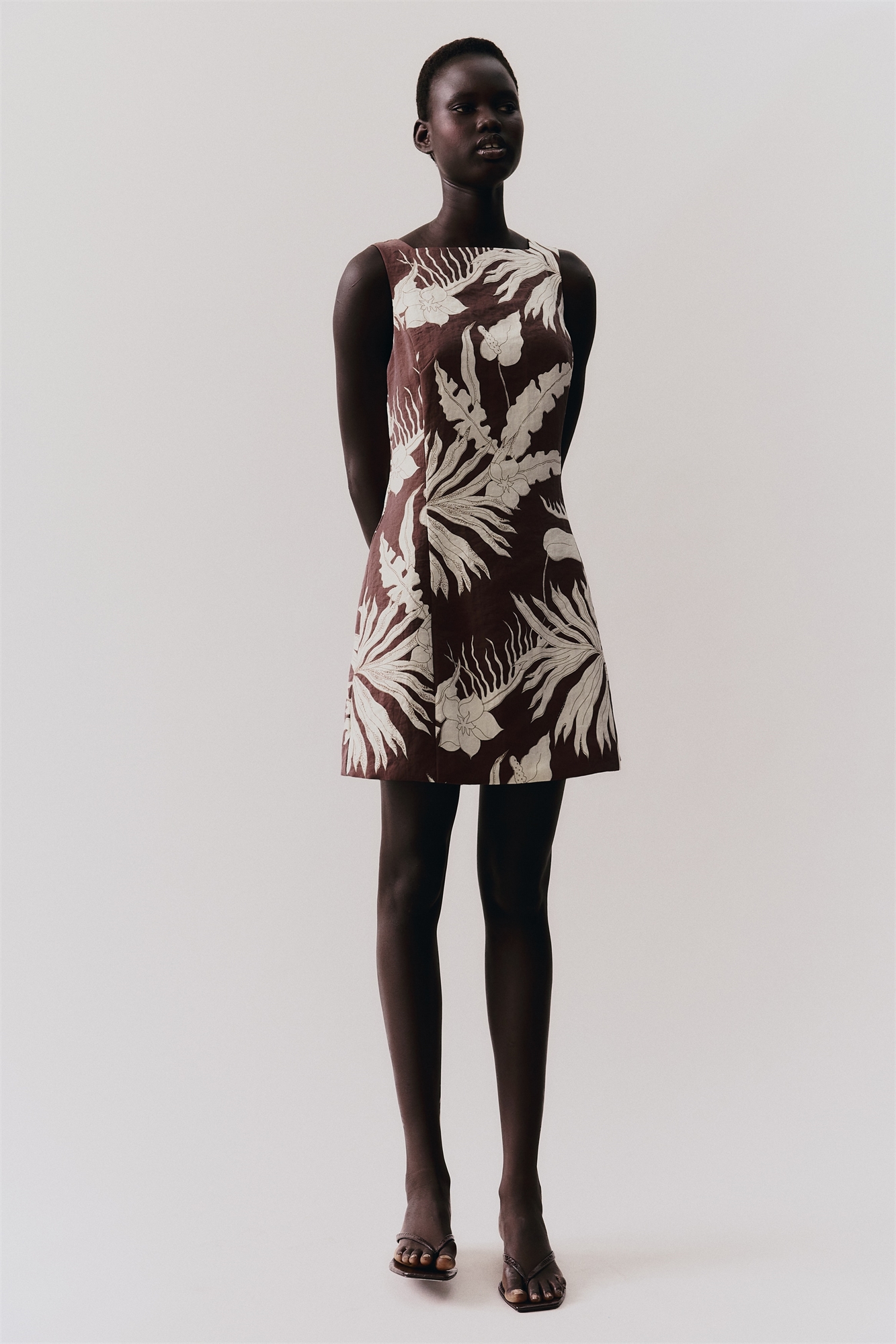 Короткое приталенное платье из саржи с широкими бретелями и квадратным вырезом. Скрытая застежка-молния и застежка-крючок сзади, а также швы "принцесса" спереди и сзади для придания силуэту привлекательности. На подкладке.