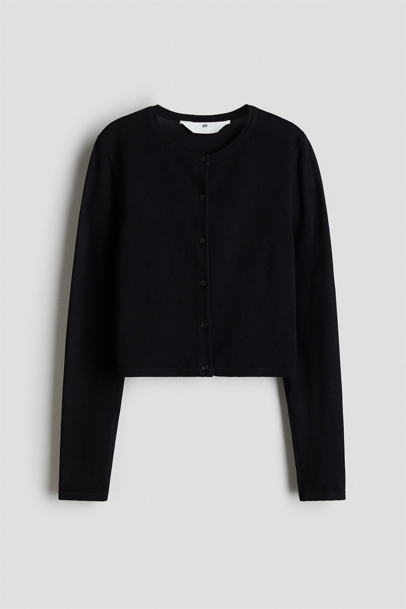 Кардиган из мягкой вискозы тонкой вязки с круглым вырезом и пуговицами спереди.