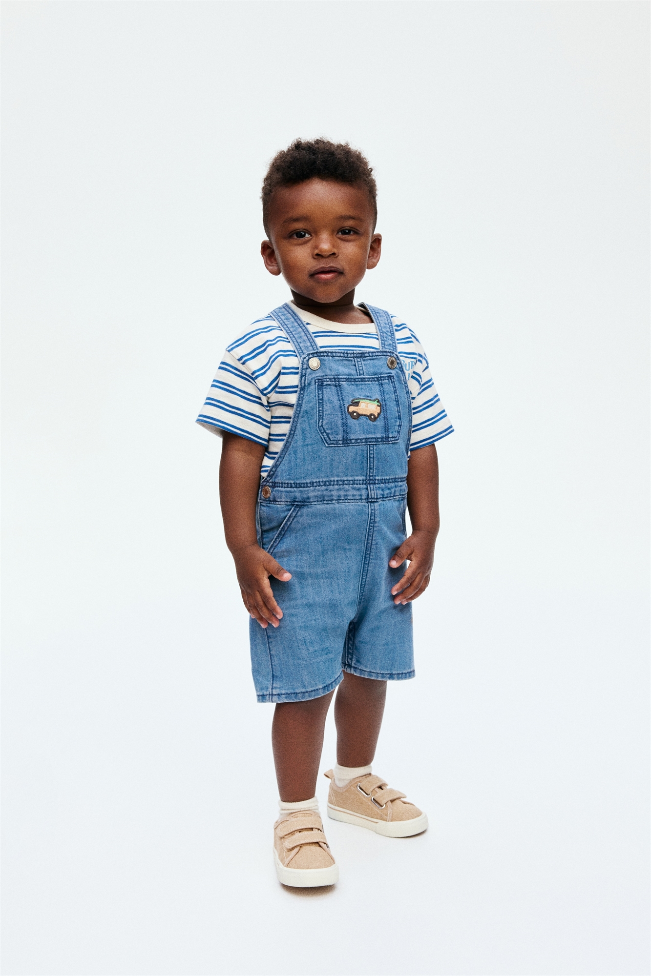 Шорты-дунгари из мягкого денима с небольшой вышитой аппликацией спереди и сзади. Регулируемые плечевые ремни с прижимными планками, нагрудный карман, декоративные передние карманы и открытый задний карман. Застежки по бокам и на ногах для удобства переодевания.