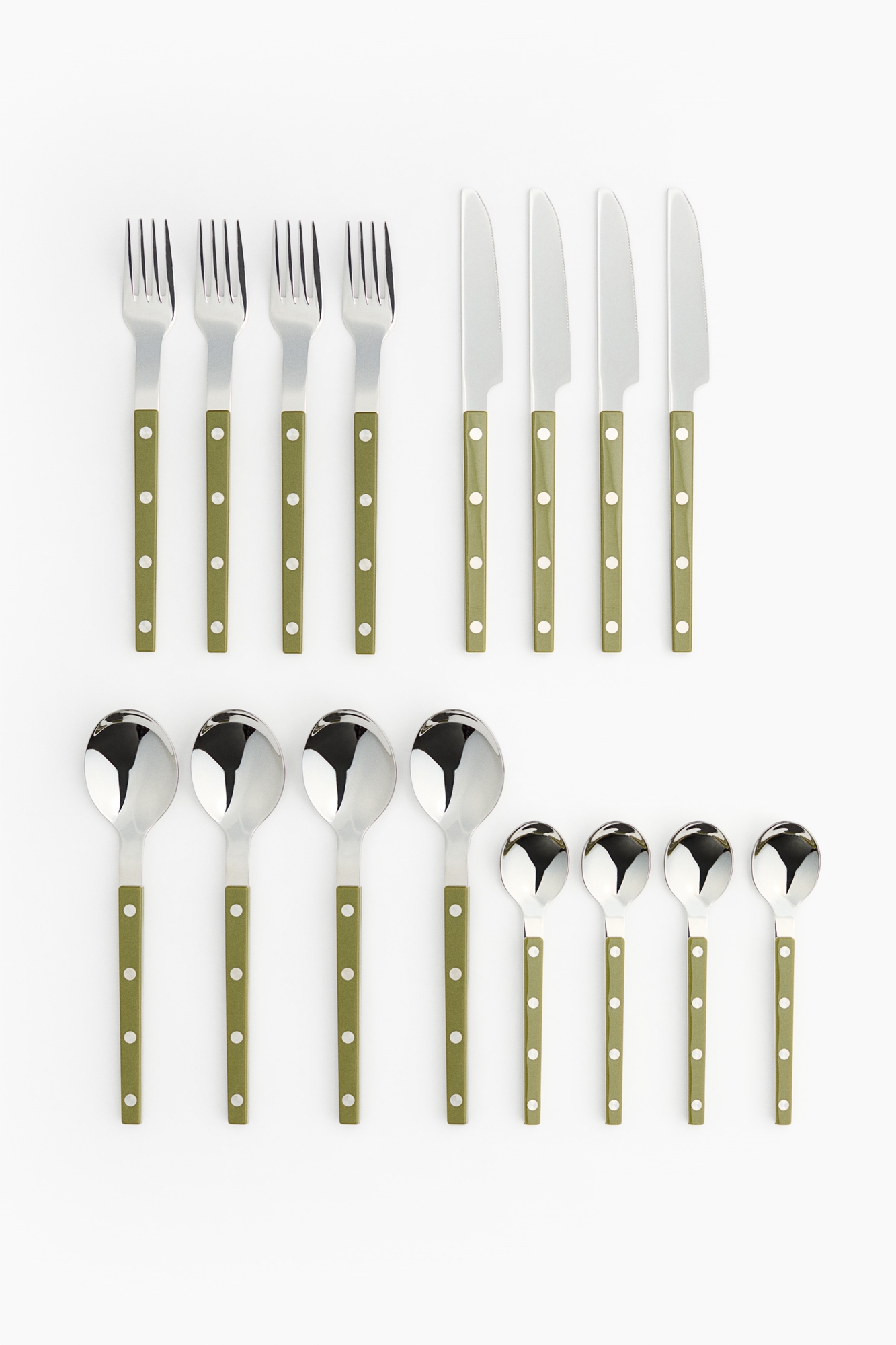 Полный набор из четырех вилок, ножей, ложек и чайных ложек, выполненных в классическом дизайне из нержавеющей стали, вдохновленном уютными бистро на улицах Франции. Длина: нож 22,3 см, вилка 20,3 см, ложка 20 см, чайная ложка 14,9 см.