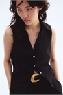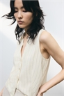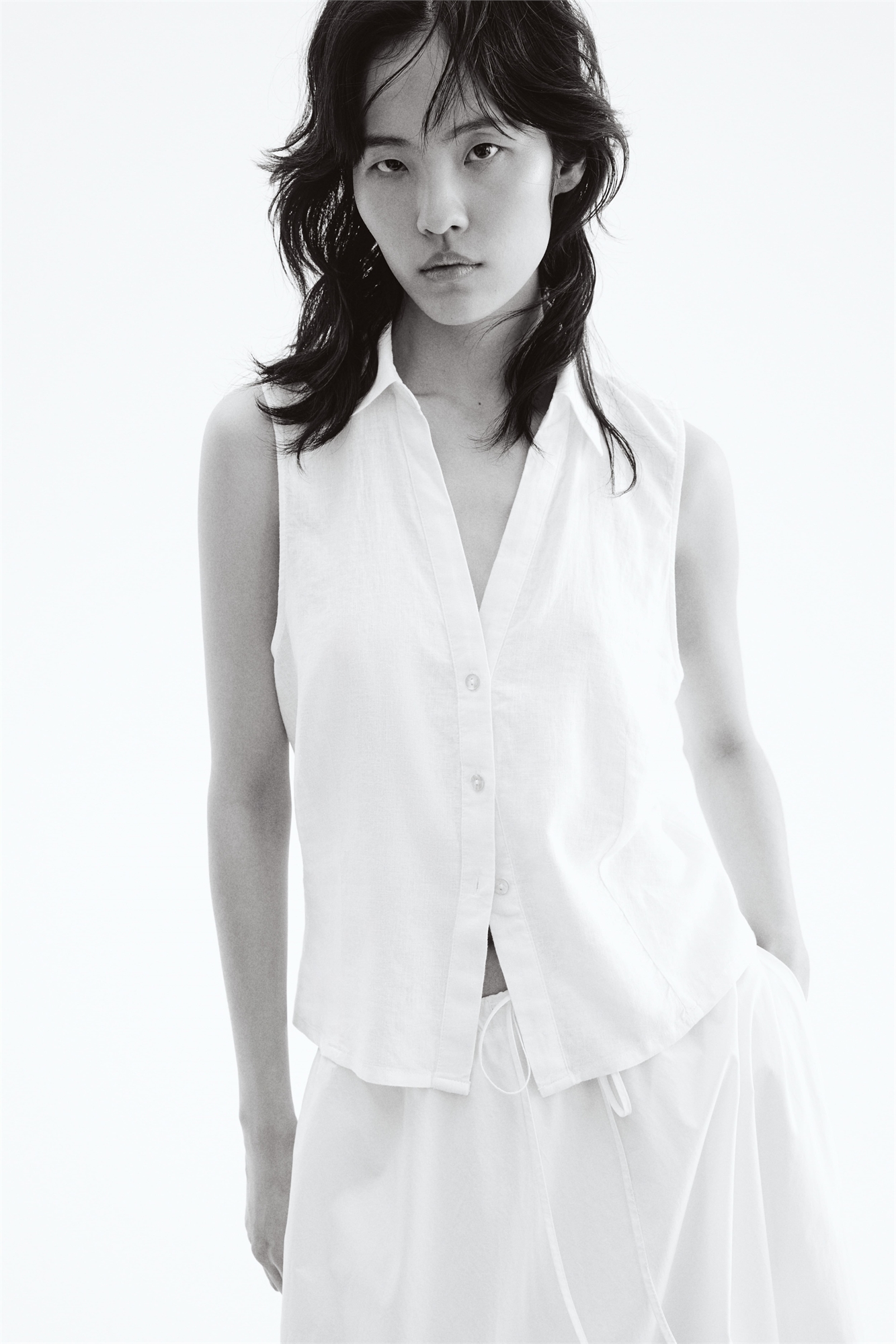 Короткая приталенная рубашка воздушного плетения из смеси льна и вискозы. Модель без рукавов, с открытым воротником и застежкой на пуговицы спереди. Формирующие вытачки спереди и сзади для придания силуэту стройности.