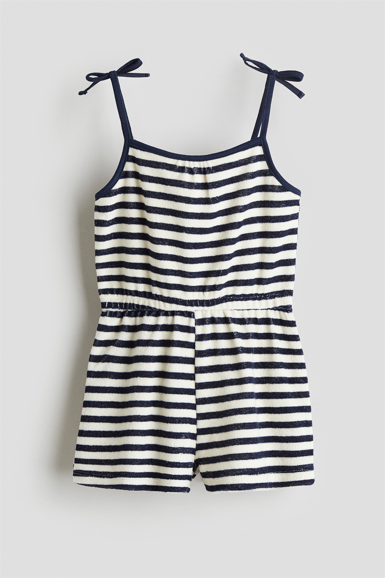 Мягкий махровый комбинезон без рукавов с принтом по всей длине и узкими бретелями с пришитыми бантиками. Круглый вырез, сборки в верхней части и эластичная резинка на талии.
