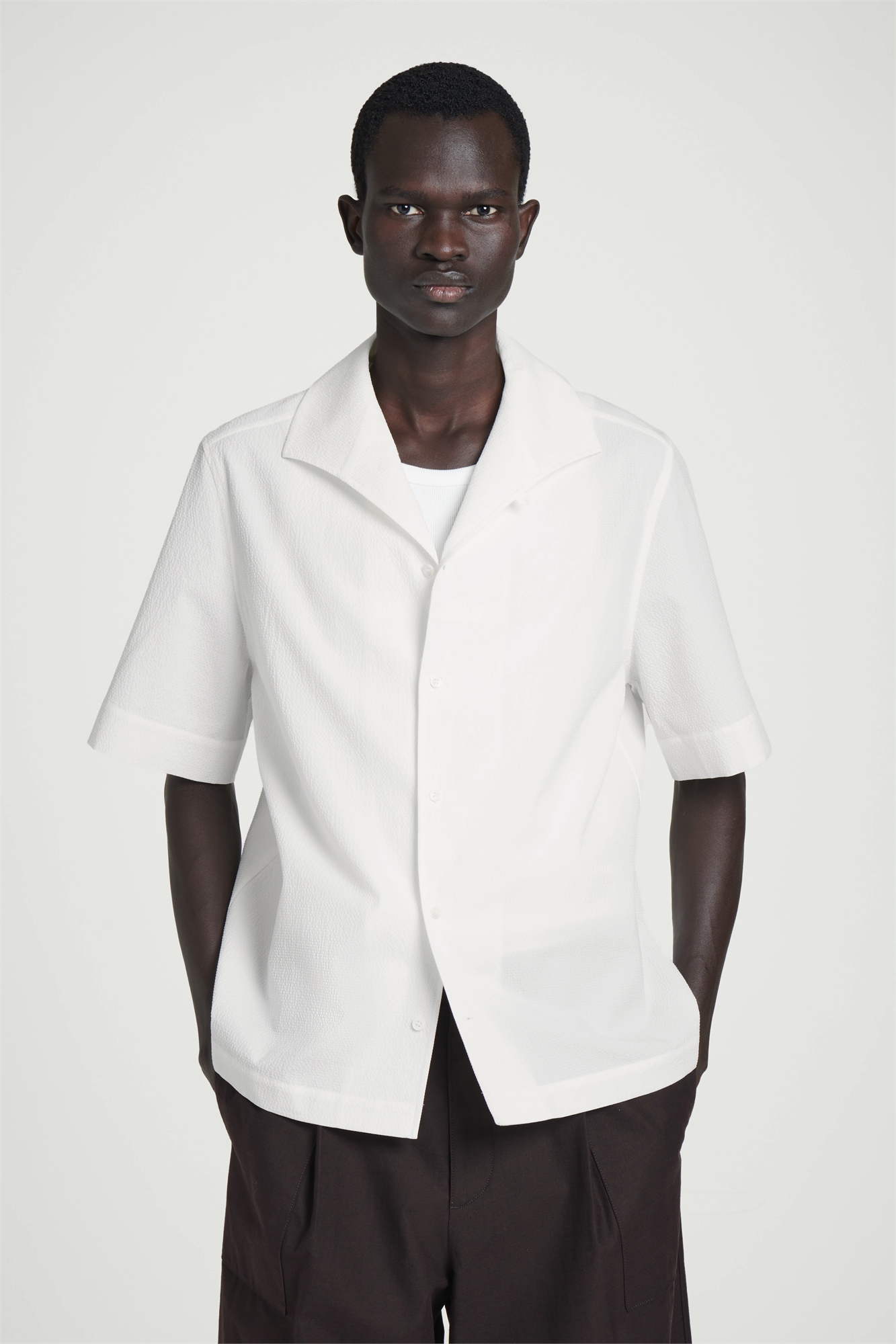 Динамичные текстуры занимают центральное место в коллекции мужской одежды. Эта современная рубашка с короткими рукавами, перламутровыми застежками и воротником-стойкой, который можно застегнуть на пуговицы, чтобы создать более классический образ. Regular fitButton closureRecycled polyester is polyester made from PET bottles or end-of-life textile waste. ПЭТ-бутылки или текстильные отходы подвергаются механической переработке и перерабатываются в новую пряжу Ткань: 68% хлопка, 31% переработанного полиэстера, 1% эластана. Без учета отделки / Машинная стирка Длина по спинке для размера M составляет 70 см / Модель носит размер M