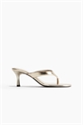Сандалии из лакированной ткани с закругленными носками, узким ремешком, мыском и закрытым каблуком.