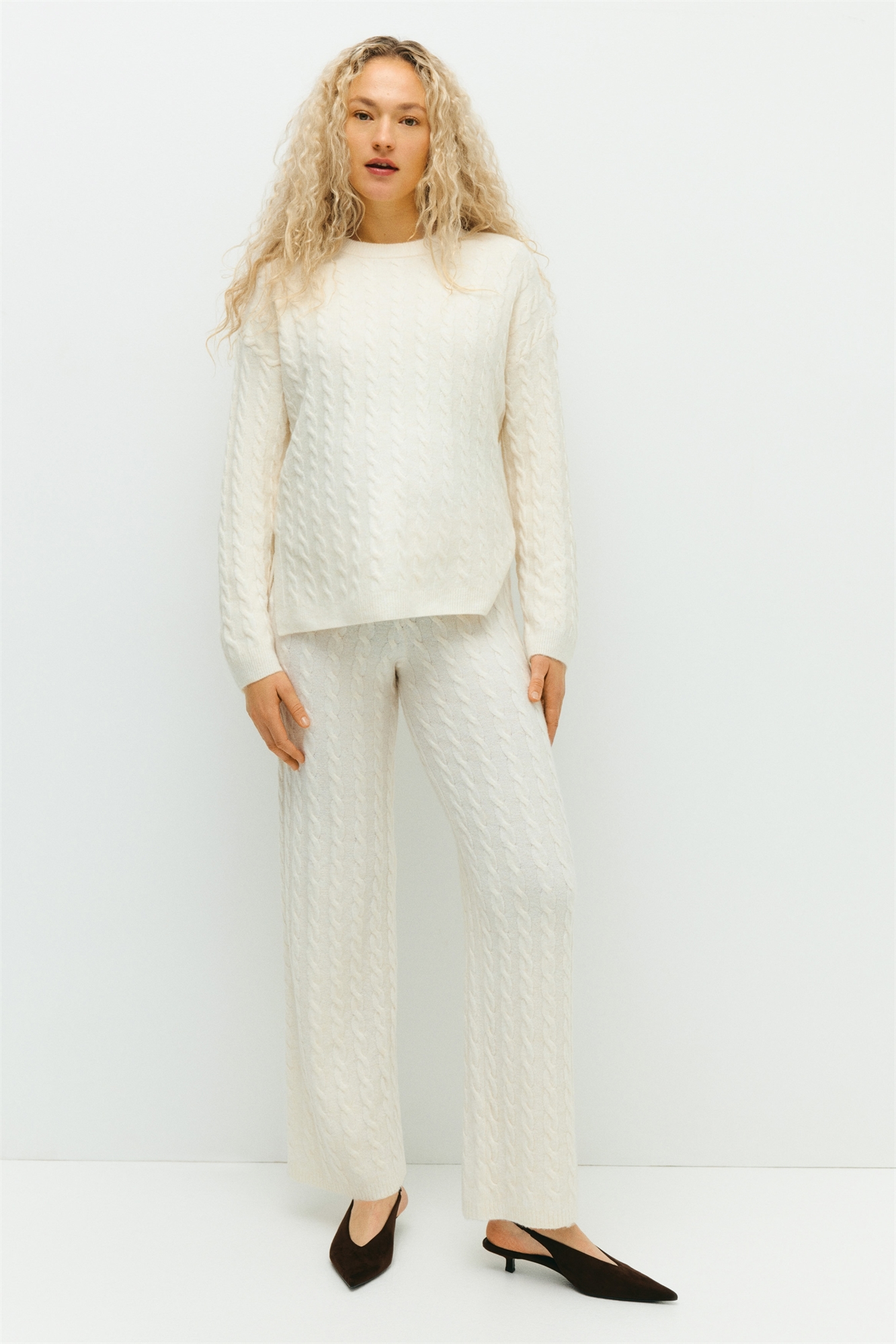 Брюки свободного кроя из мягкого трикотажа в "косы", с заниженной эластичной талией и прямыми брючинами. Узкий рубчик на подоле.