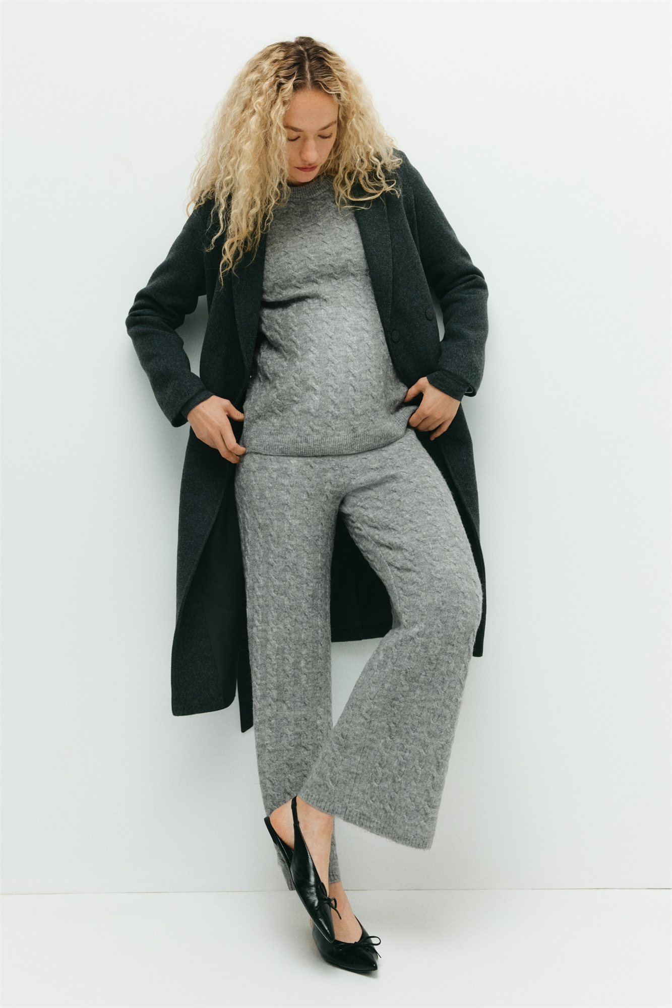 Брюки свободного кроя из мягкого трикотажа в "косы", с заниженной эластичной талией и прямыми брючинами. Узкий рубчик на подоле.