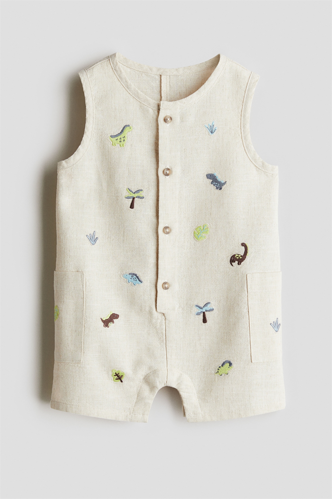 Костюм-ромпер без рукавов из мягкой ткани из смеси хлопка и льна с вышитыми деталями. Круглый вырез, застежка на пуговицы спереди и открытые карманы по бокам. Скрытые кнопки внизу для удобства переодевания (кроме размеров 1-4Y).