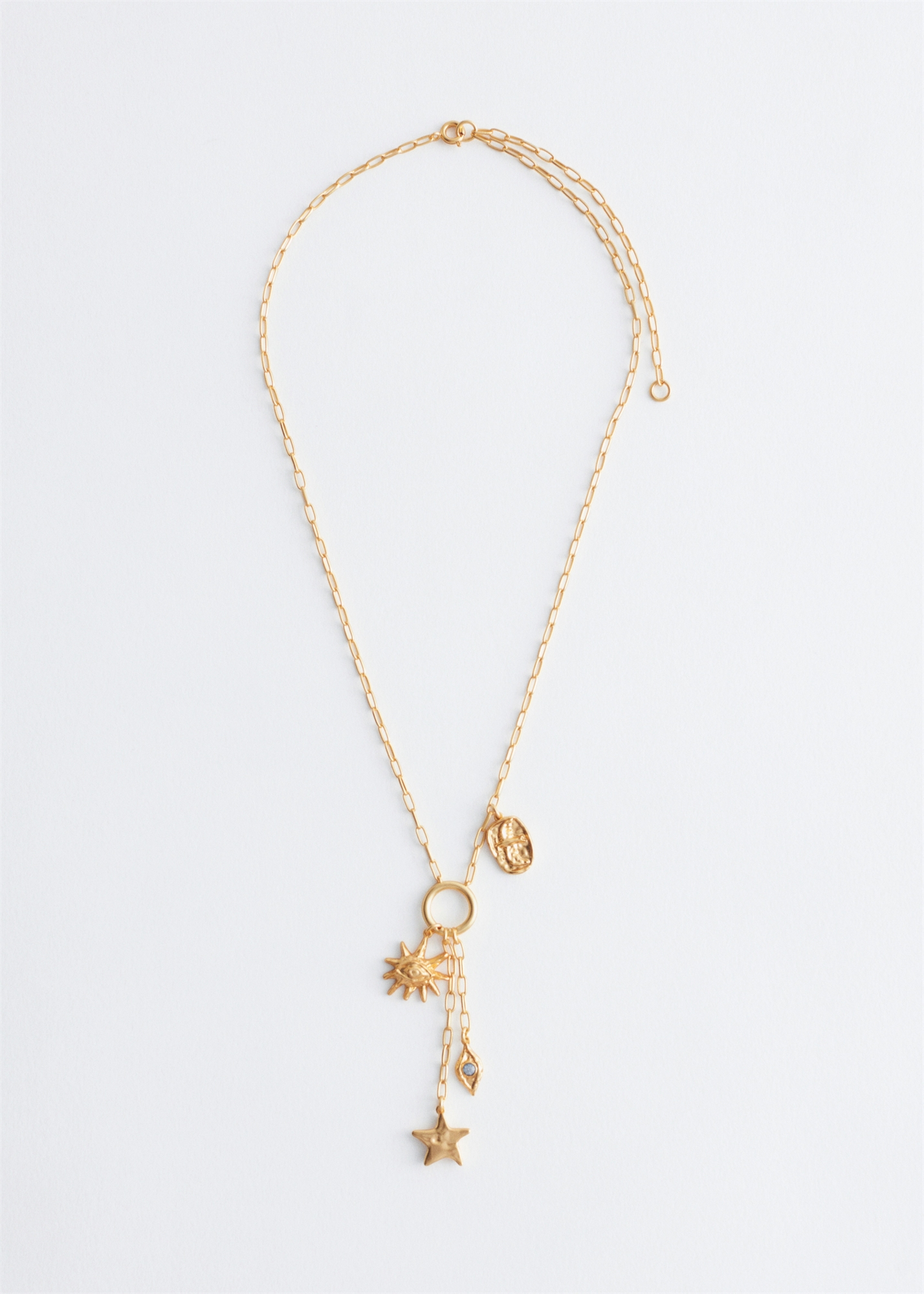 Изготовленное из полированной латуни, это ожерелье в стиле лариат сделано из цепочки со скрепками и имеет кольцо на переднем стыке, к которому прикреплены цепочки и фигурные шармы. Все брелоки имеют текстурированную поверхность. Ожерелье имеет регулируемую длину и застежку в виде пружинного кольца. Проверено никелем Общая длина: 50 см / 19,7”