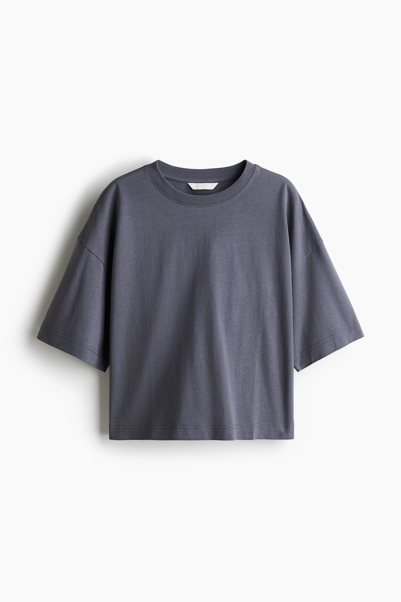 Футболка в стиле бокси из мягкого хлопкового джерси с горловиной и спущенными плечами. Свободный крой, рукава длиной до локтя и прямой подол.