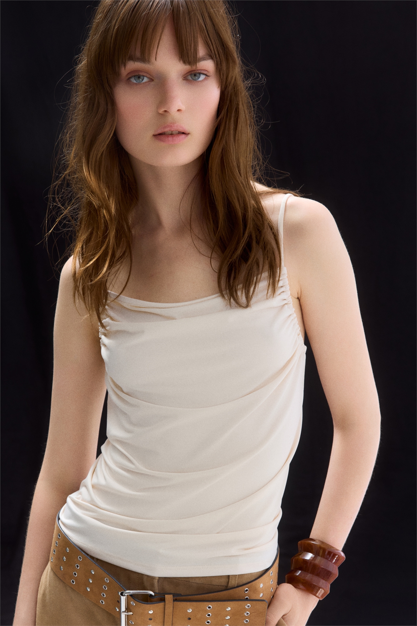 Топ из крепового джерси с прямым вырезом и регулируемыми бретелями-спагетти, которые проходят по бокам спереди и создают эффект рюша.