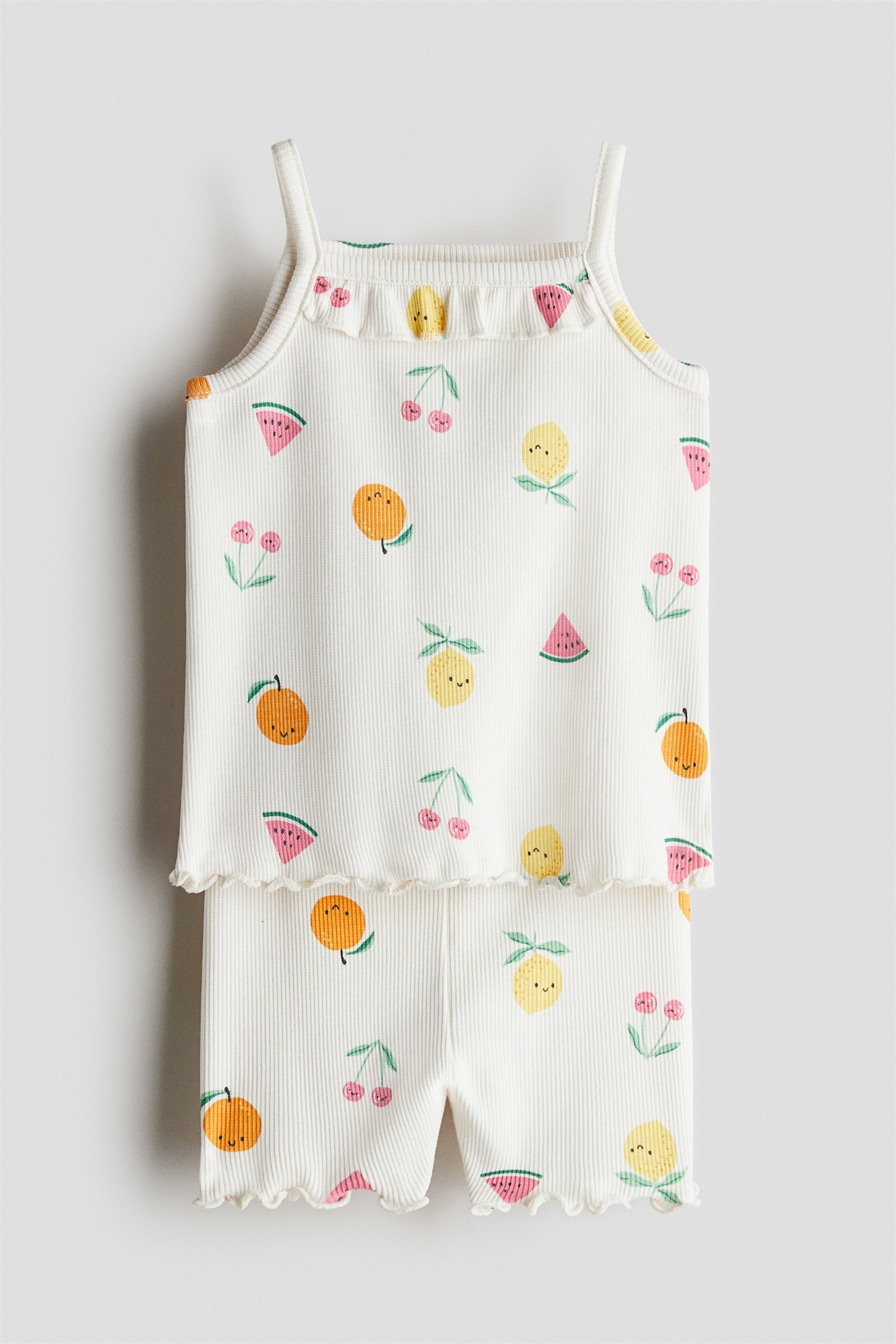 Комплект из топа на бретельках и велошорт из мягкого ребристого хлопкового джерси с принтом на всю длину и отделкой оверлоком. Топ на бретелях с квадратным вырезом, отделанным оборками. Велосипедные шорты с регулируемой эластичной талией.