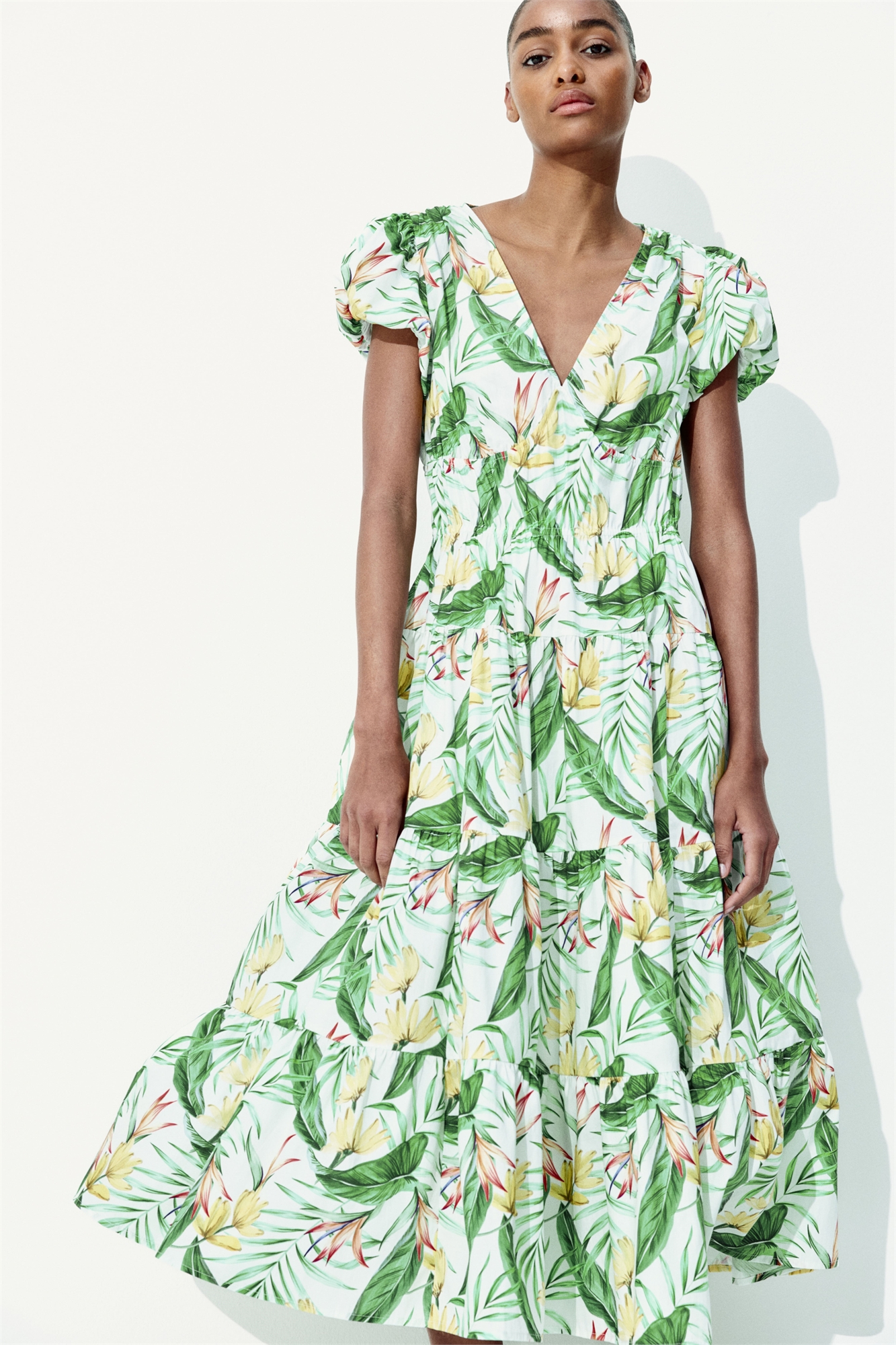 Платье длиной до колен из хлопкового поплина с глубоким V-образным вырезом и узкой эластичной резинкой на талии. Короткие пышные рукава и расклешенная юбка с ярусами для придания объема.