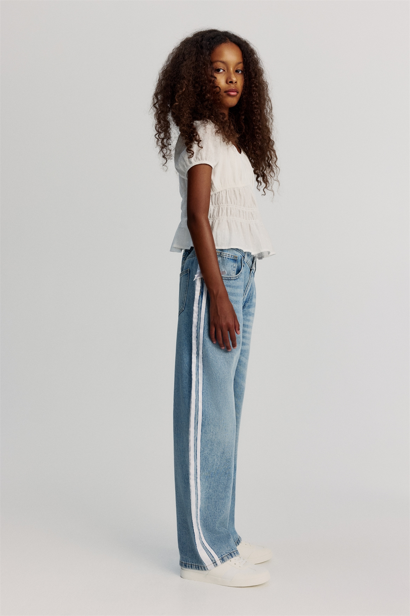 Блузка из мягкого хлопкового полотна с эластичным вырезом "балерина", пышными рукавами, платочной вставкой на талии и расклешенным подолом.
