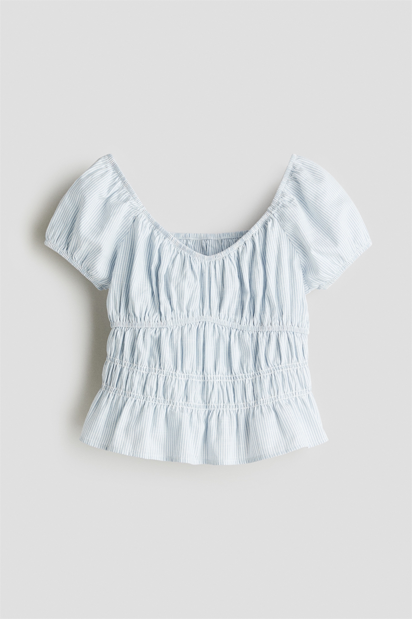 Блузка из мягкого хлопка с эластичным вырезом "балерина", пышными рукавами, отделкой в виде плавок и расклешенным подолом.