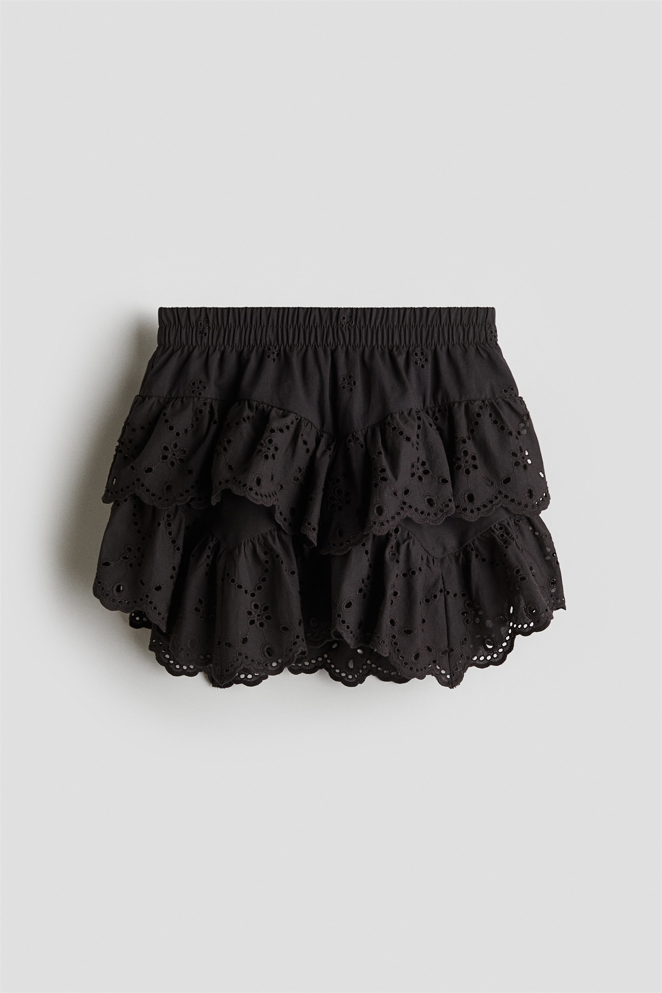 Юбка из воздушного хлопкового переплетения с рисунком "бродери англез". Потайная эластичная резинка на талии и V-образные сборки с ярусами. На подкладке.