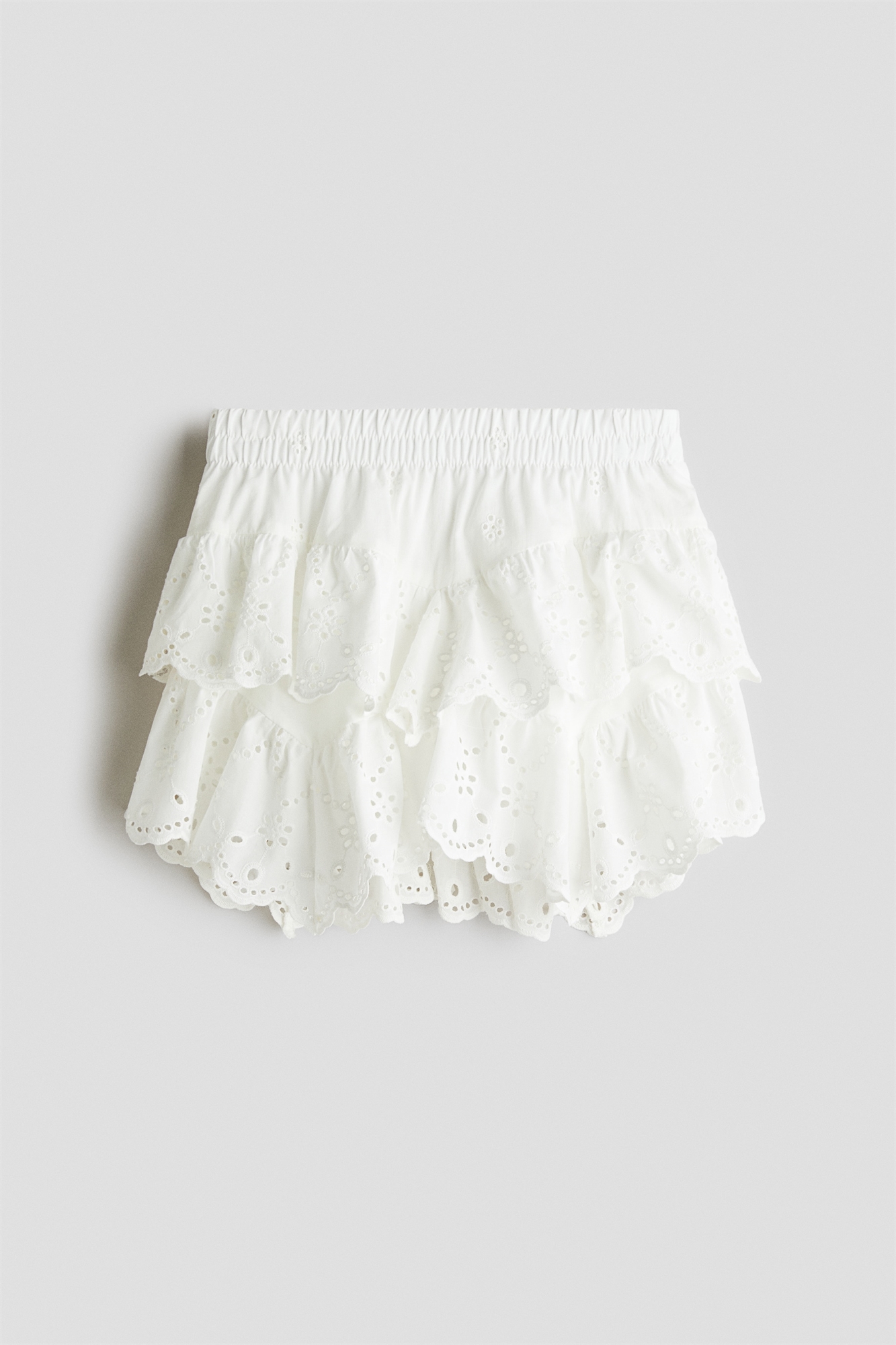 Юбка из воздушного хлопкового переплетения с рисунком "бродери англез". Потайная эластичная резинка на талии и V-образные сборки с ярусами. На подкладке.