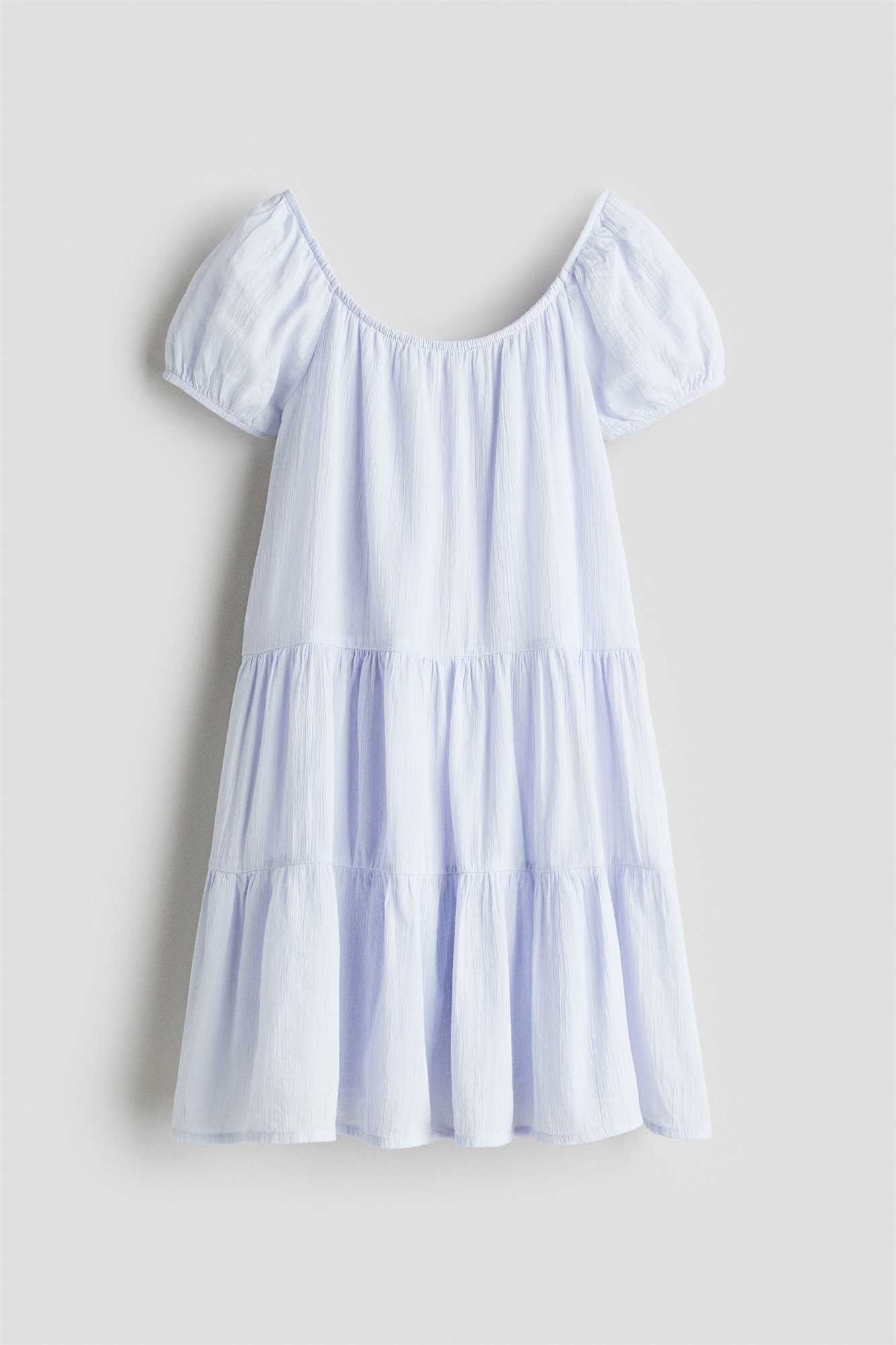 Платье из мягкого хлопкового полотна с эффектом "кринкруста" с вырезом "балерина" и узкой эластичной резинкой. Короткие пышные рукава с эластичными манжетами и расклешенная юбка с собранными ярусами для придания объема. Хлопковая подкладка.