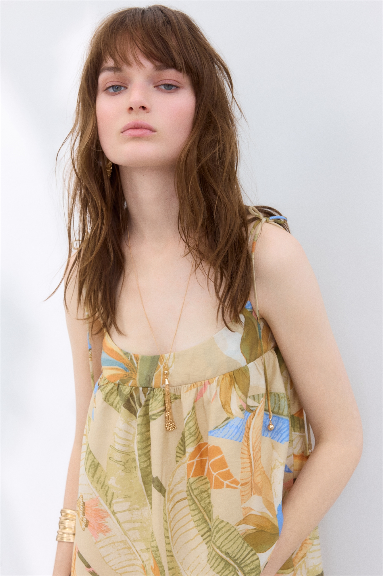 Длинное расклешенное платье из тканого материала с прямым вырезом и завязками на бретелях-спагетти. Узкая резинка сзади и собранные ярусы по всему дизайну для придания дополнительного объема.