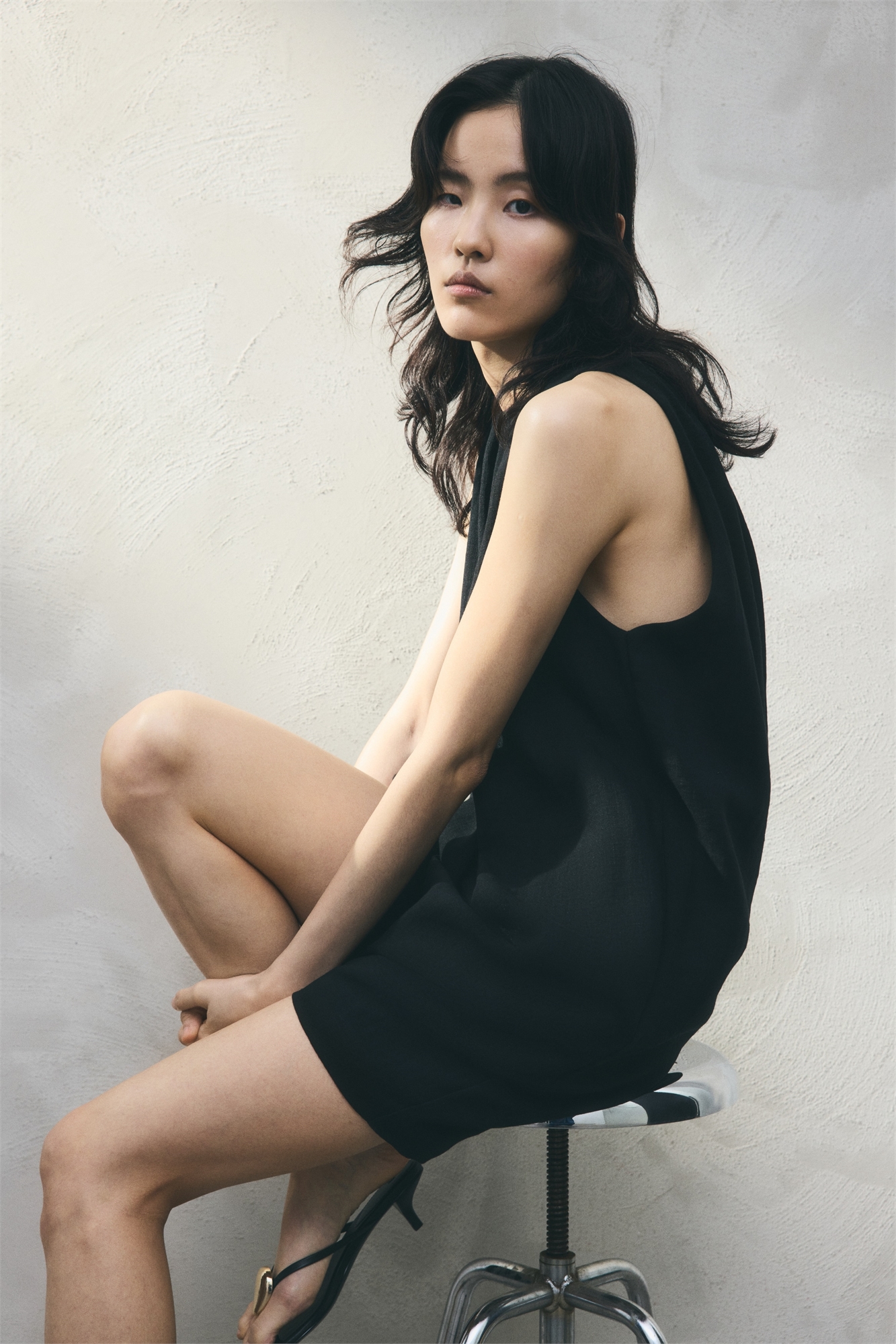 Короткое платье без рукавов из тканого материала с круглым вырезом со сборками по всему периметру и потайной застежкой на молнию и крючок-глаз сзади. Небрежные боковые карманы и прямой подол. На подкладке.