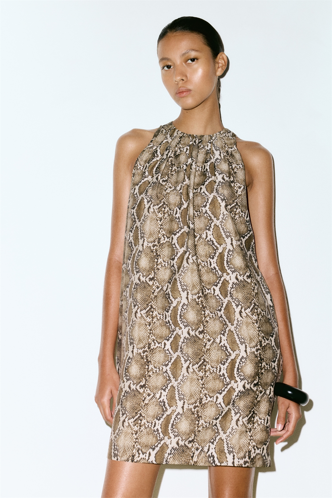 Короткое платье без рукавов из тканого материала с круглым вырезом со сборками по всему периметру и потайной застежкой на молнию и крючок-глаз сзади. Небрежные боковые карманы и прямой подол. На подкладке.