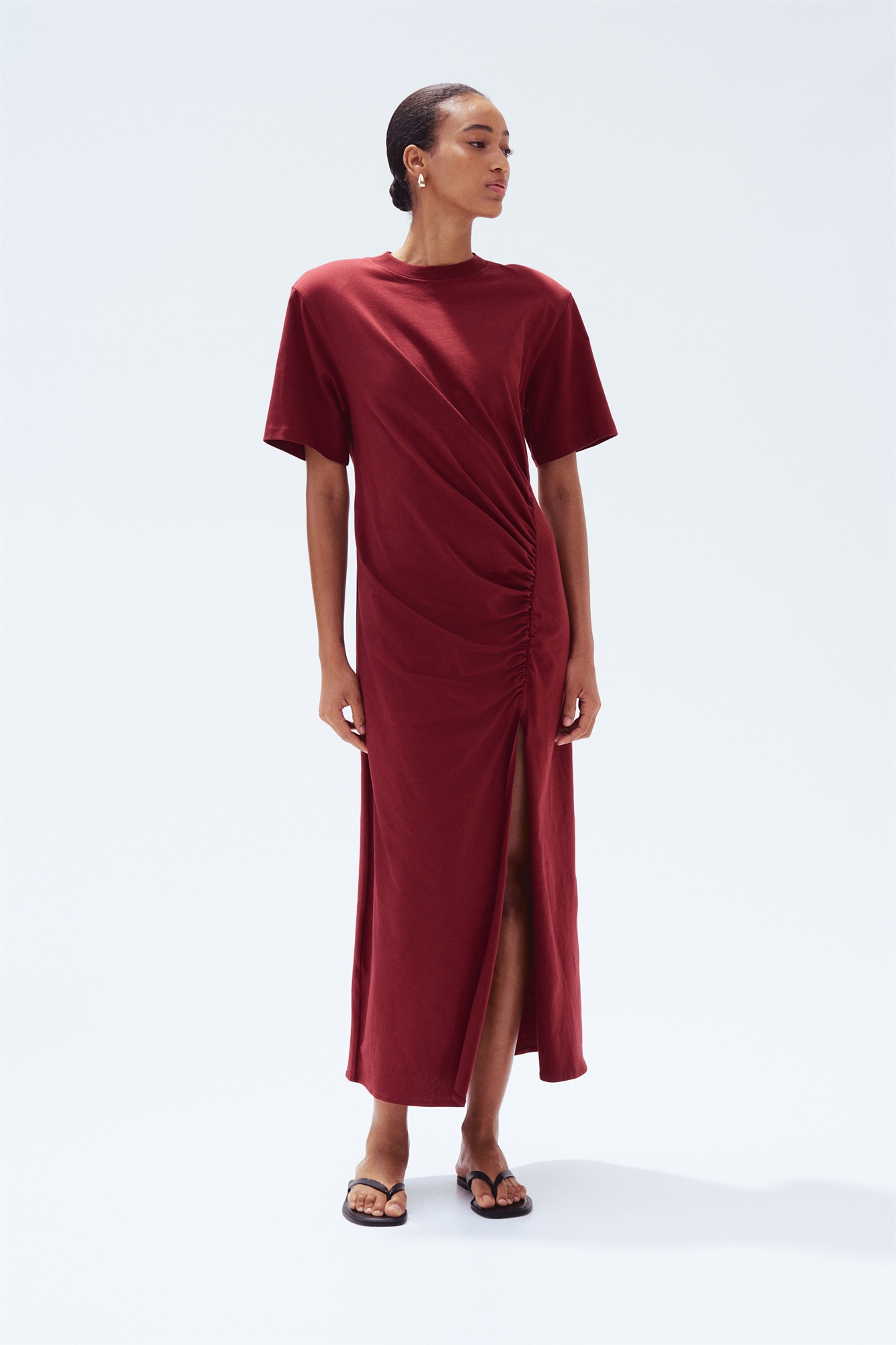Длинное платье-футболка из хлопкового джерси с ребристой горловиной и смелыми подплечниками. Облегающий крой с драпировкой на одном бедре и фигурным швом в сборку, заканчивающимся высоким разрезом.