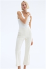 Брюки длиной до щиколоток из тканого материала с высокой талией, скрытой эластичной резинкой и потайной застежкой на молнию с одной стороны. Облегающие ноги с вшитыми складками спереди и расклешенными подолами.