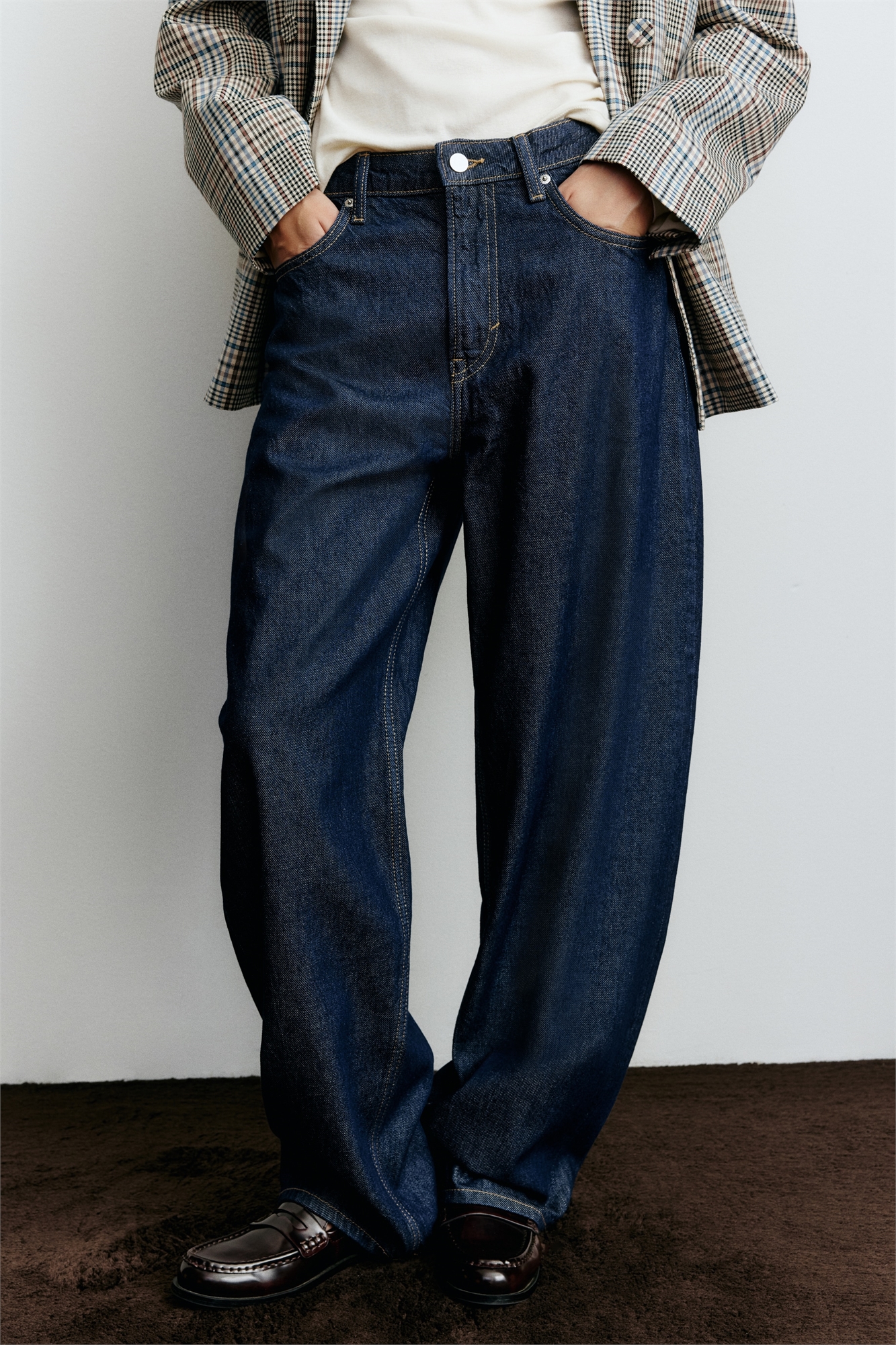 Джинсы с 5 карманами из хлопкового денима. Изогнутые, объемные ноги со свободной посадкой от бедра до бедра и зауженной мешковатой посадкой от бедра вниз. Высокий пояс с ширинкой на молнии и пуговице.