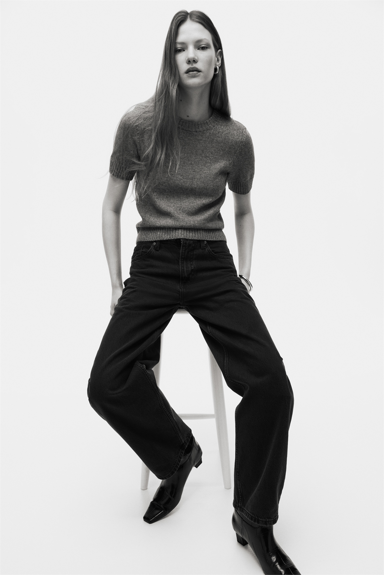 Джинсы с 5 карманами из хлопкового денима. Изогнутые, объемные ноги со свободной посадкой от бедра до бедра и зауженной мешковатой посадкой от бедра вниз. Высокий пояс с ширинкой на молнии и пуговице.