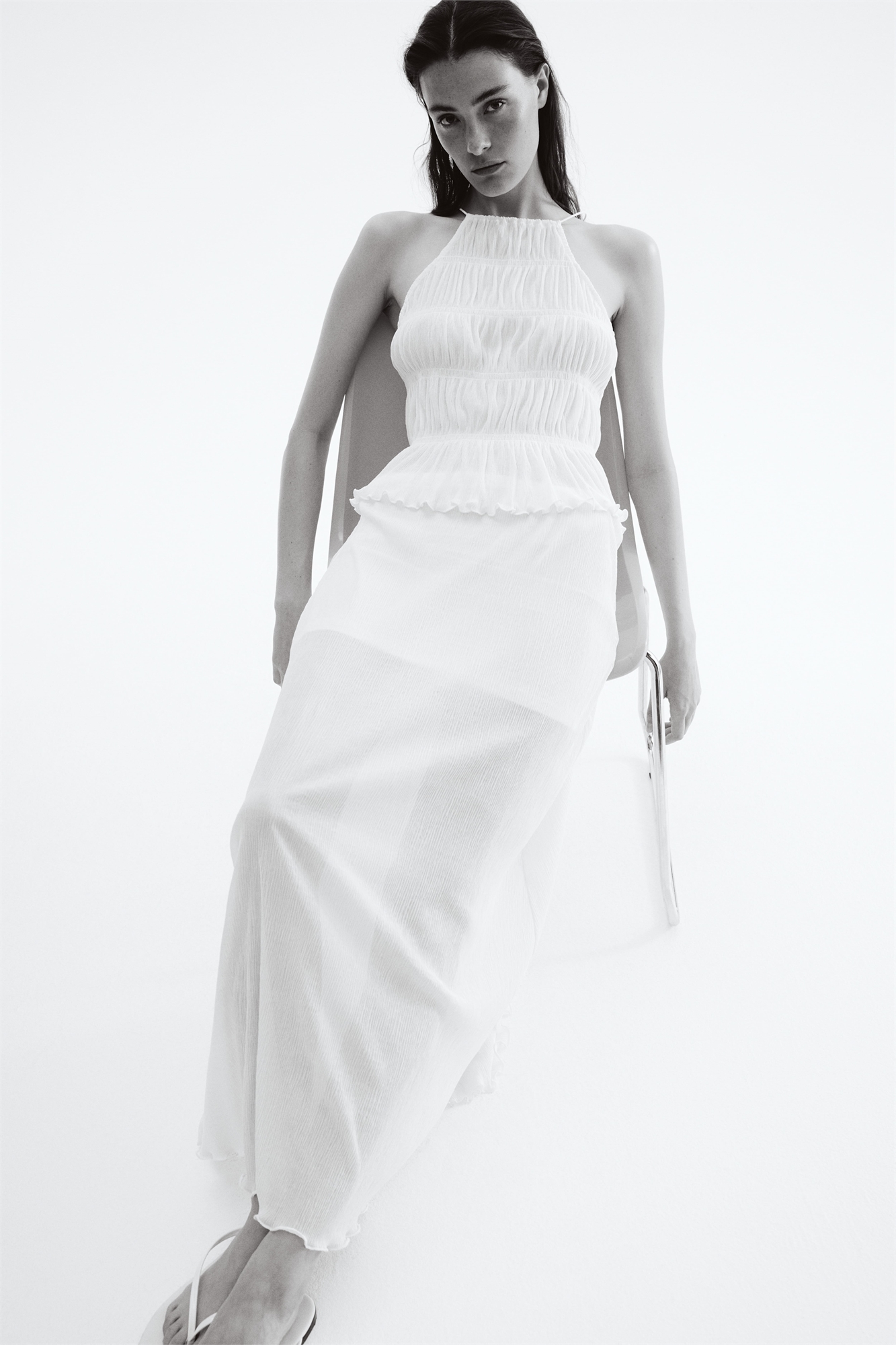 Длинная юбка из трикотажа плиссе с высокой эластичной талией и подолом, обработанным оверлоком. Короткая нижняя юбка.