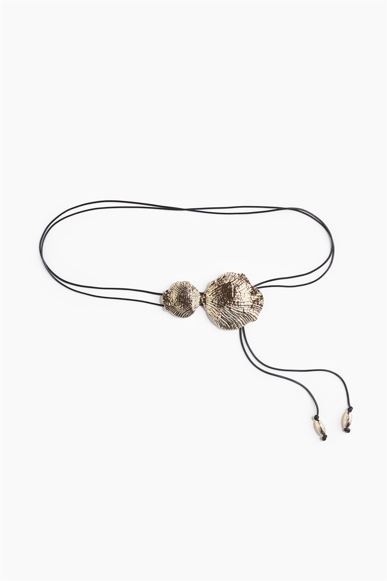 Узкий пояс с двумя ремешками из ткани с покрытием и длинными концами, украшенными бисером. Металлические детали в форме ракушек спереди.