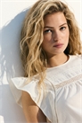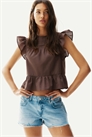Блузка из мягкого хлопкового полотна, украшенная кружевными вставками и пинтаками. Круглый вырез с замочной скважиной и пуговицей сзади, рукава-воланчики и расклешенная складка.