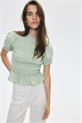 Приталенная блузка с вырезом-лодочкой и расклешенным подолом. Короткие пышные рукава с узкой резинкой и оборкой на манжетах.