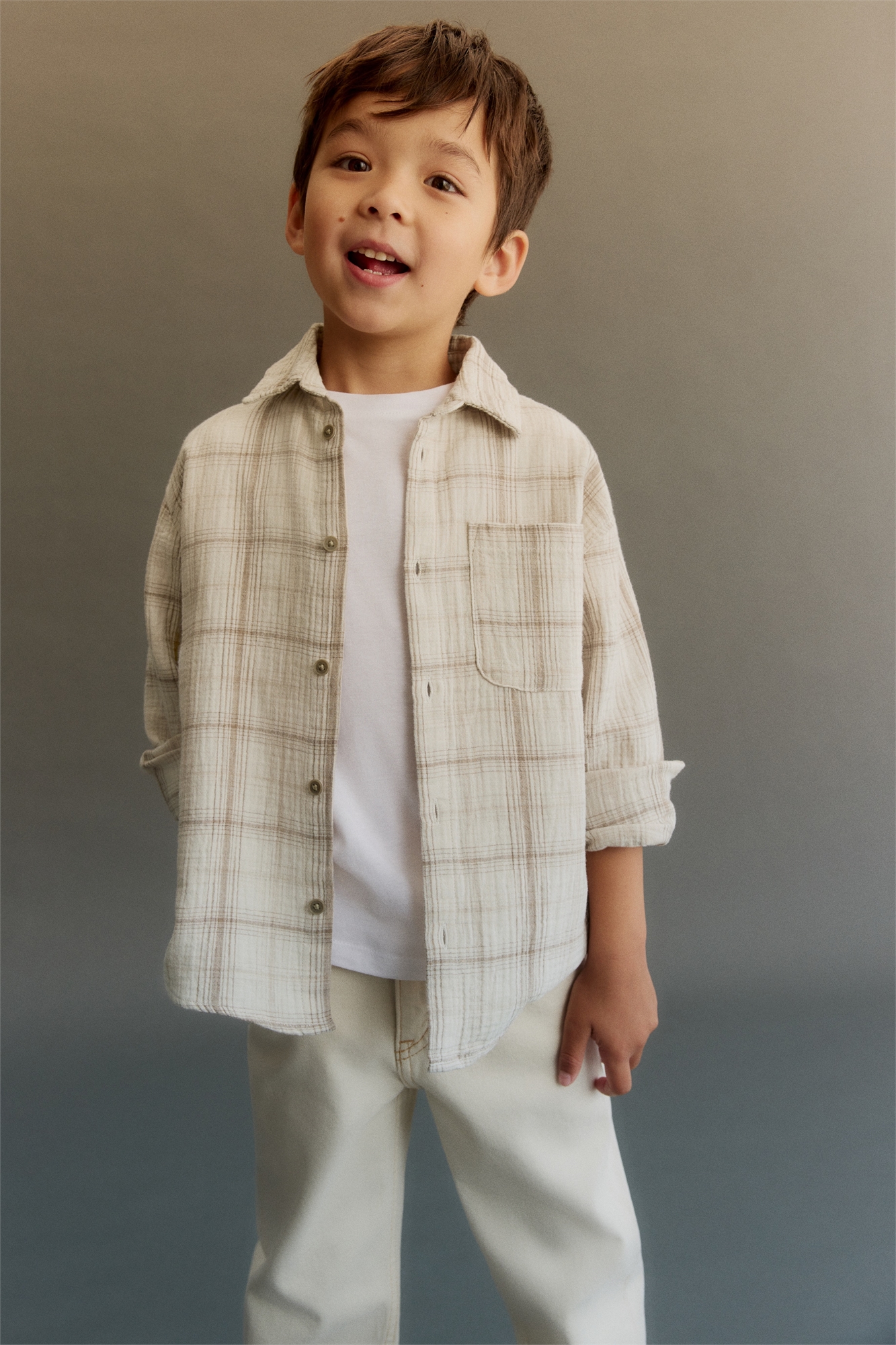 Свободная рубашка из мягкого хлопкового муслина с отложным воротником, пуговицами спереди и ярмом сзади. Накладной нагрудный карман, длинные рукава с манжетами на пуговицах и мягко закругленный подол.