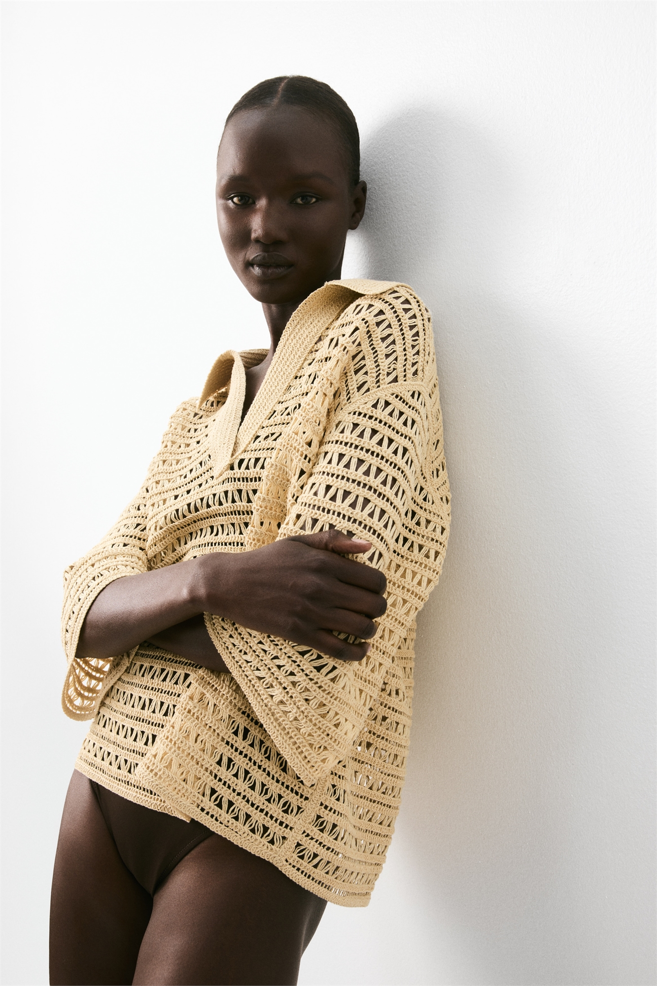 Рубашка-поповер с открытым воротником, спущенными плечами и рукавами длиной 3/4. Прямой подол.