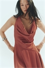 Короткое платье без рукавов из тканого материала с вырезом-водопад и расклешенной юбкой с диагональным швом от бедра для придания объема. Без подкладки.