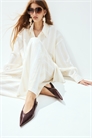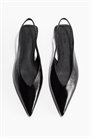 Босоножки из блестящей кожи с заостренным носком и эластичным ремешком на пятке с одной стороны. Кожаные подкладка и стелька.