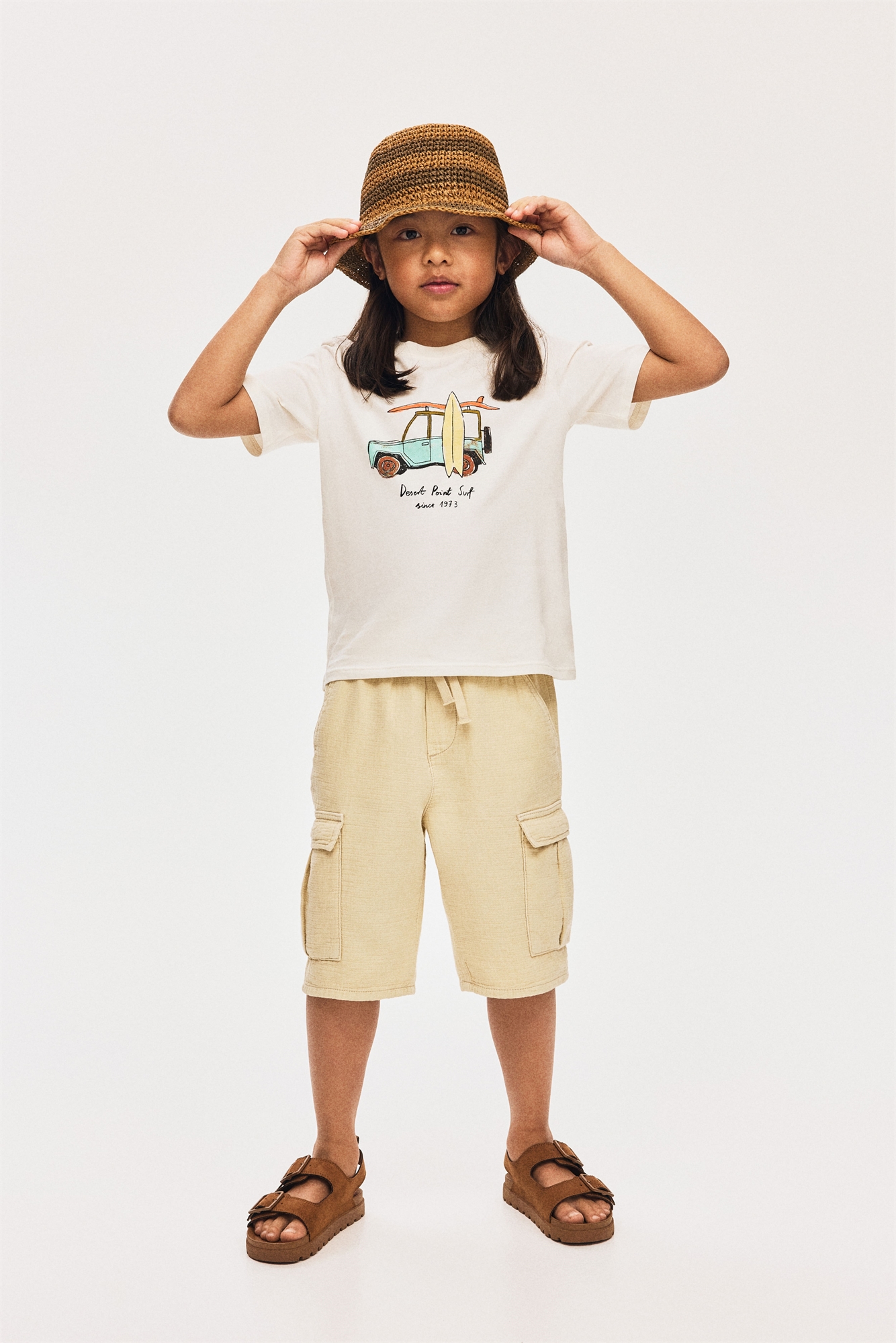 Шорты из мягкой ткани с эластичным утягивающим поясом и фальшивой ширинкой. Диагональные передние карманы, накладные карманы на ногах и задний карман.