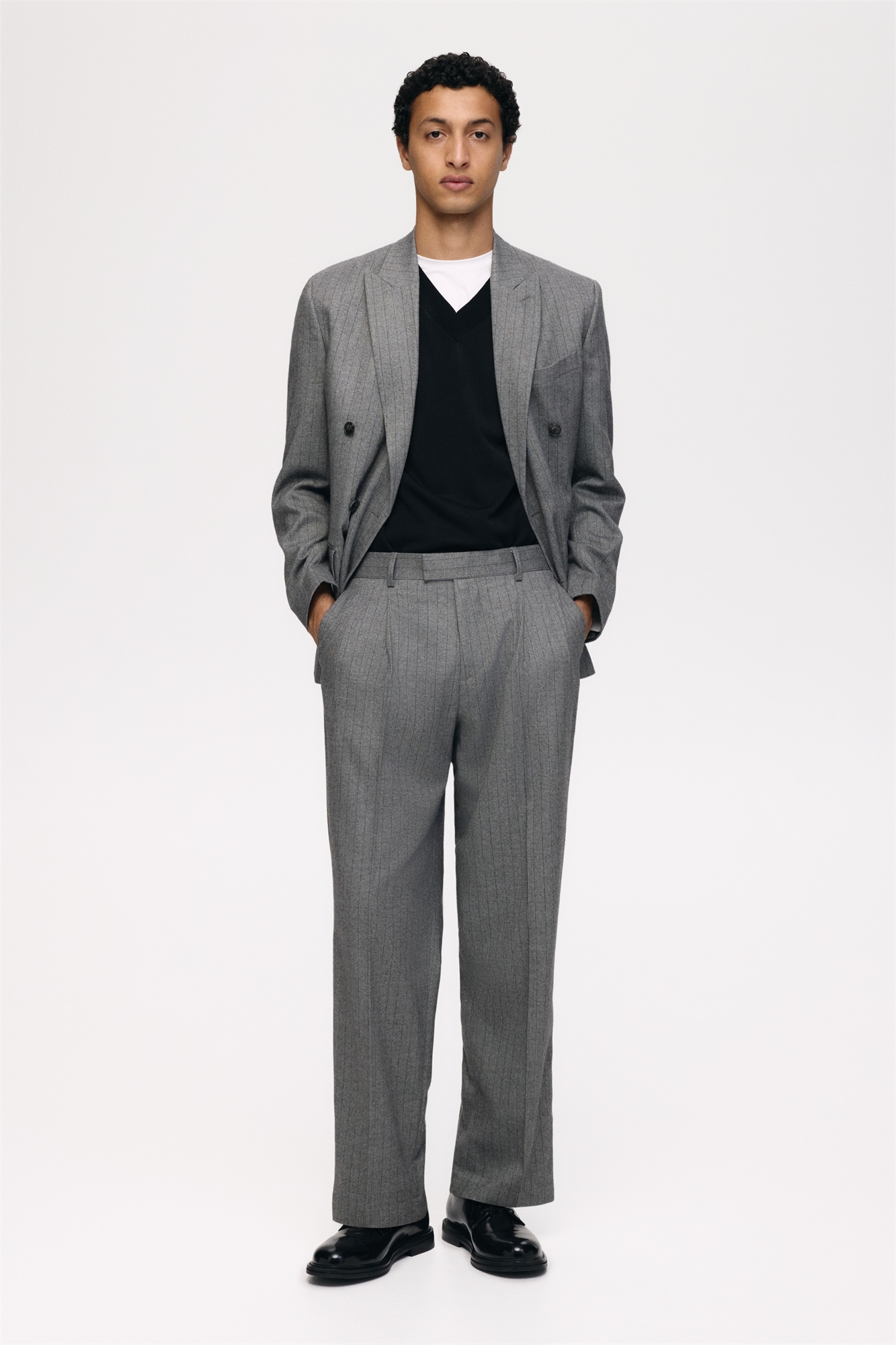 Костюмные брюки мягкого плетения с ширинкой на молнии, удлиненным поясом со скрытой застежкой на пуговицу и крючок, боковыми карманами, втачными задними карманами на пуговице и ногами со складками. Регулярный крой для комфортной носки и классический силуэт.