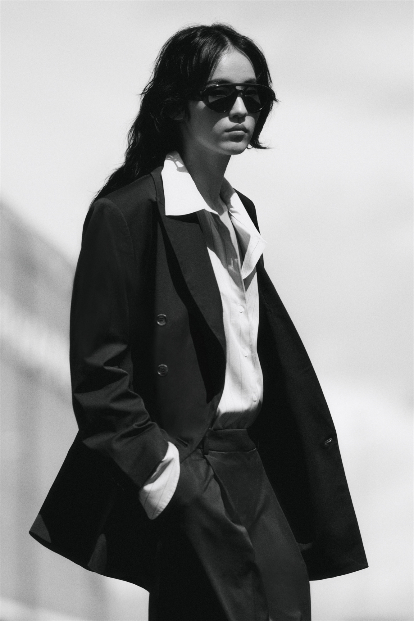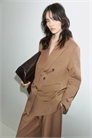 Блейзер оверсайз из саржи с пикообразными лацканами и двубортной передней частью. Нагрудный карман, накладные передние карманы с клапаном, подплечники и длинные рукава с декоративными пуговицами на манжетах. Одиночная вентиляция на спине. На подкладке.