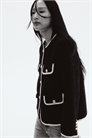 Жакет из букли с круглым вырезом и металлическими пуговицами спереди. Накладки на плечах, декоративные пуговицы на манжетах, накладные нагрудные карманы и накладные передние карманы с клапаном и пуговицей.