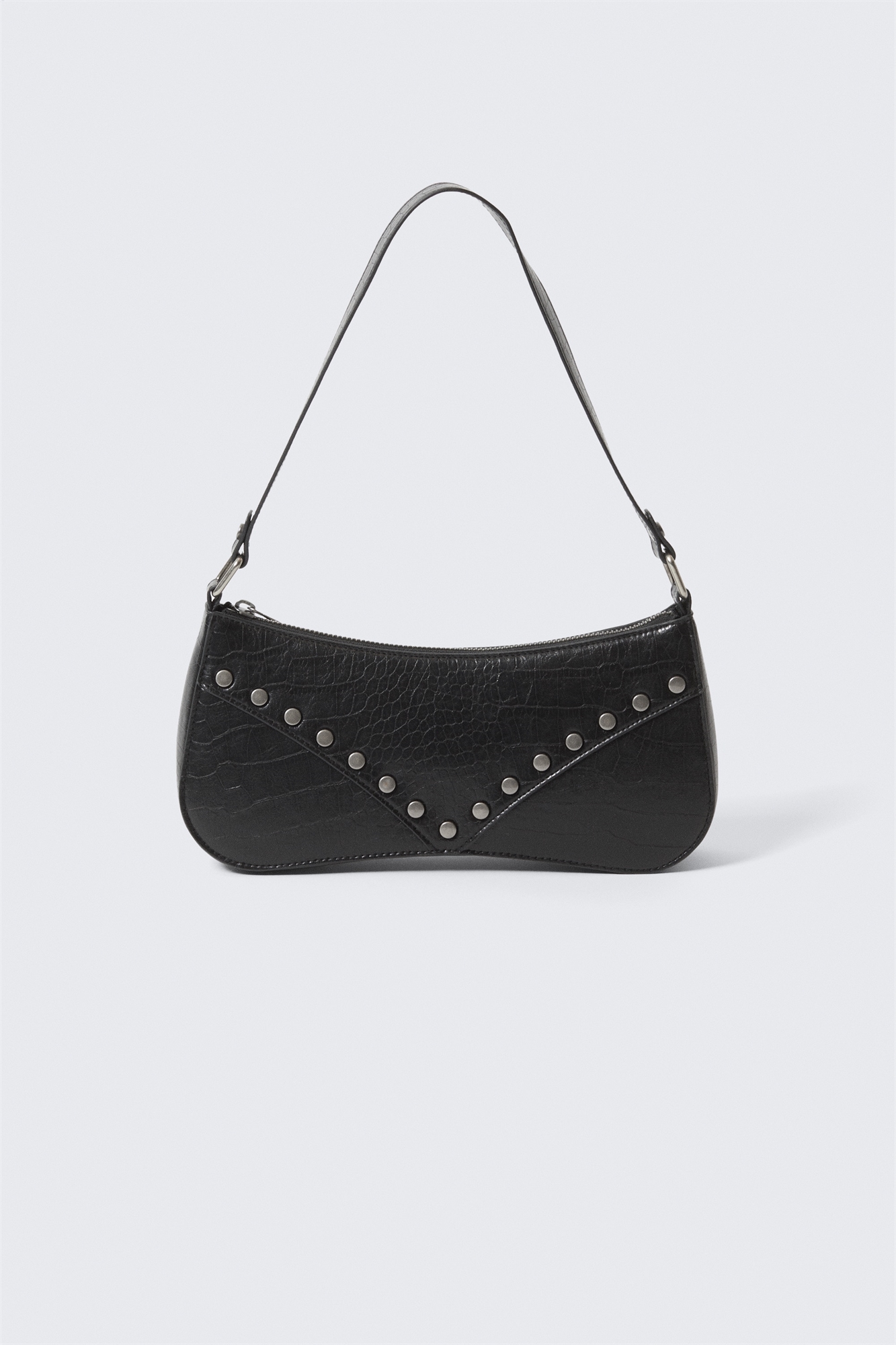 Небольшая сумка через плечо из гладкой искусственной кожи с матовым тиснением под крокодила. Сумка имеет строгий силуэт и украшена серебристыми шипами, застежкой-молнией с двойной застежкой и короткой ручкой. Внутренняя отделка на подкладке и внутренний карман для повседневных мелочей. Размеры: 28 см в ширину, 13 см в высоту и 5 см в глубину.