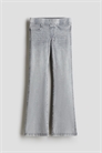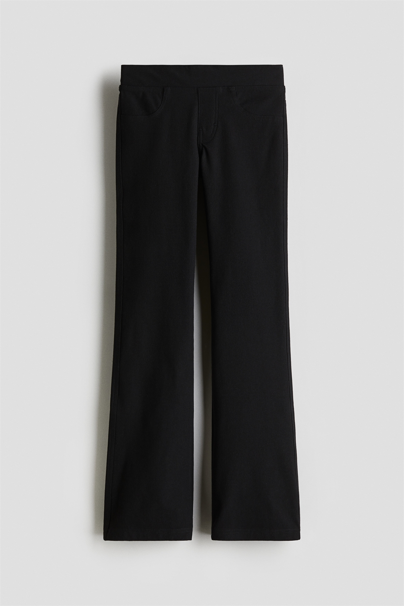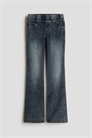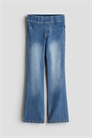 Джеггинсы из плотного джинсового трикотажа с расклешенными ногами. Эластичная талия, фальшивая ширинка, декоративные передние карманы и настоящие задние карманы.