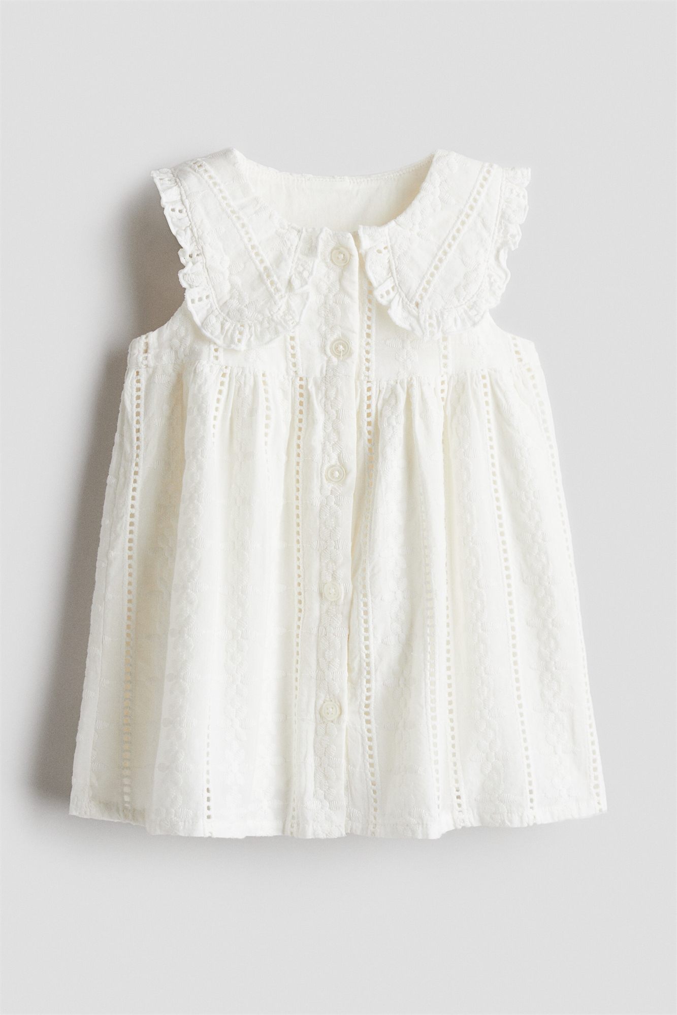 Платье без рукавов из мягкого хлопкового полотна с вышивкой. Закругленный воротник с оборками, застежка на пуговицы спереди, сборки над талией и расклешенная юбка. На подкладке.