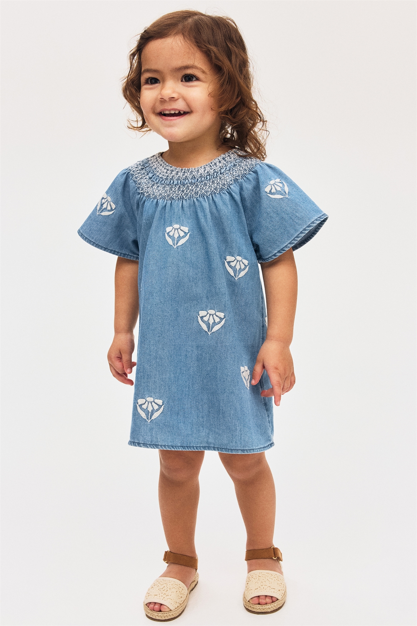 Расклешенное платье из мягкого денима из хлопкового микса с вышитыми деталями. Круглый вырез, платочная вставка в верхней части и застежка на пуговицу сзади.