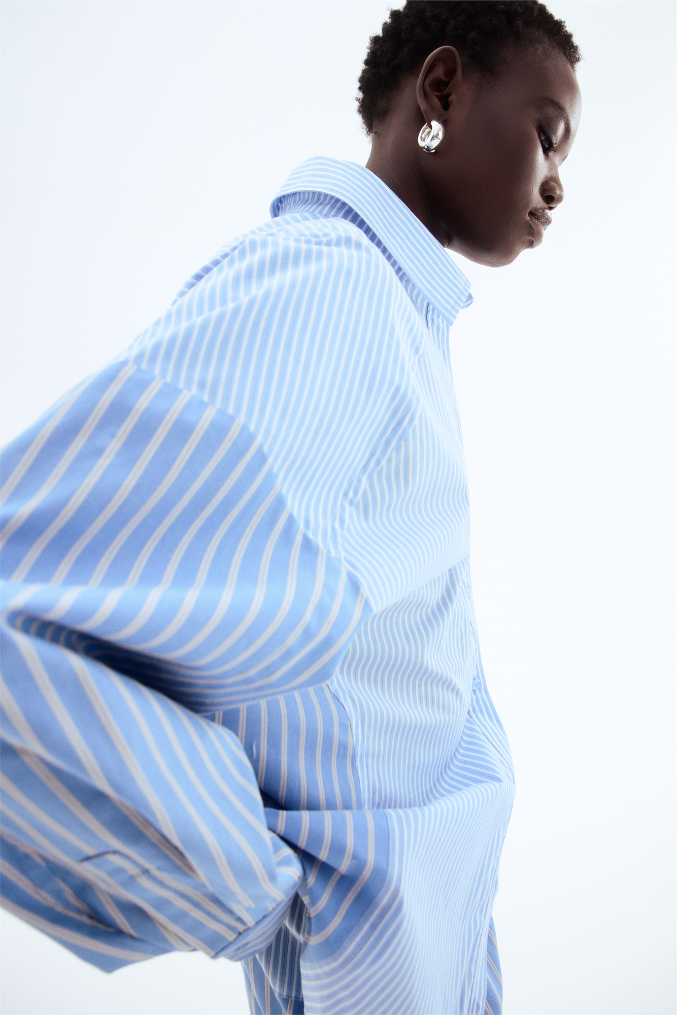 Рубашка оверсайз из хрустящего хлопкового полотна с контрастными рукавами и боковыми панелями для создания эффекта цветового блока. Воротник, застежка на пуговицы спереди, спущенные плечи, передняя и задняя панель. Длинные рукава с застежкой на пуговицы и манжетами. Подол прямого кроя.