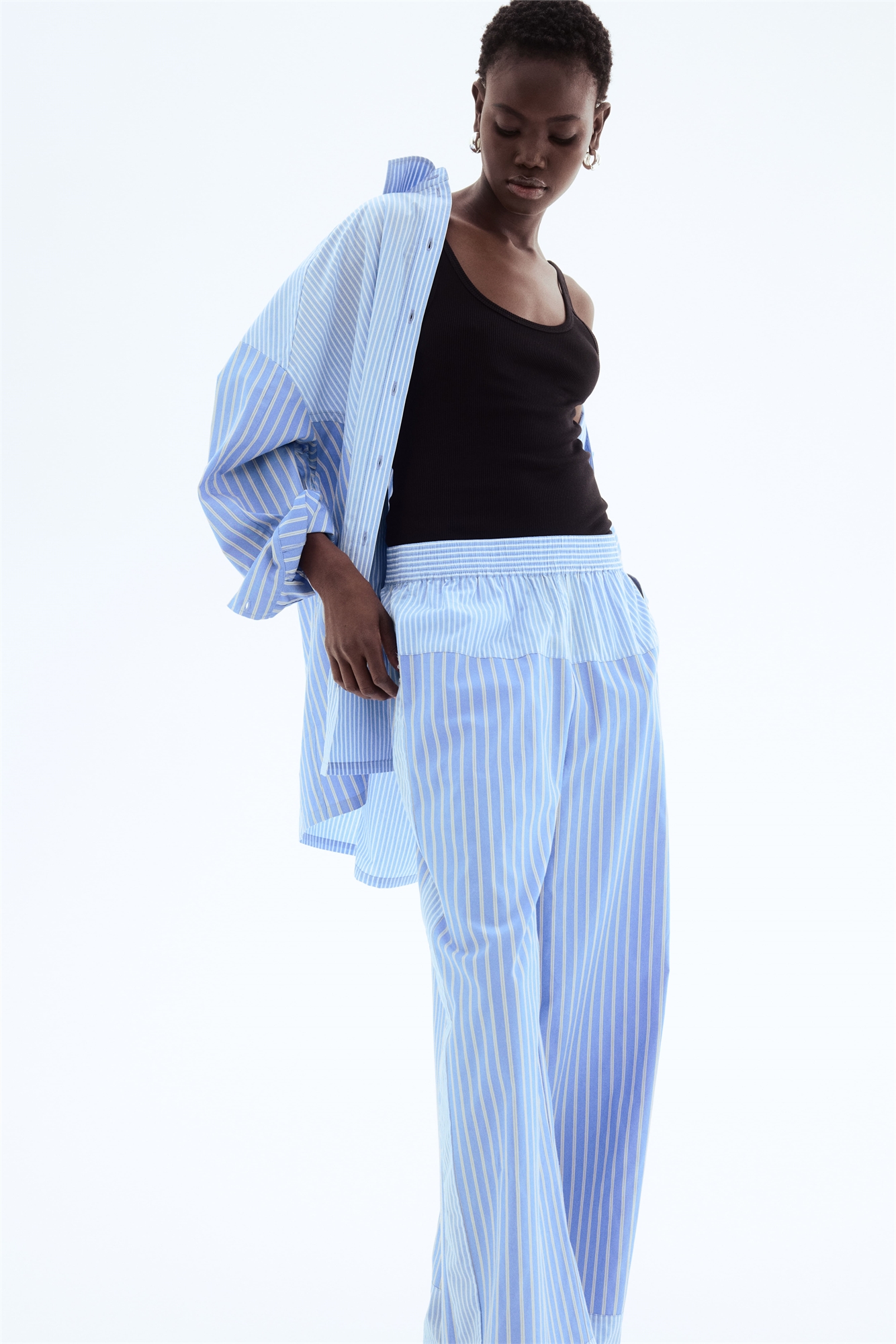 Свободные брюки из эластичного хлопка с контрастной отделкой спереди и сзади. Высокая талия с эластичным швом, неброские боковые карманы и прямые ноги.