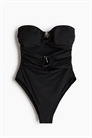 Полностью закрытый купальник-бандо с вырезами с неровными металлическими деталями спереди и чашечками со съемными вкладышами, которые формируют бюст и обеспечивают хорошую поддержку. Высокие вырезы на ногах и средняя степень защиты сзади.