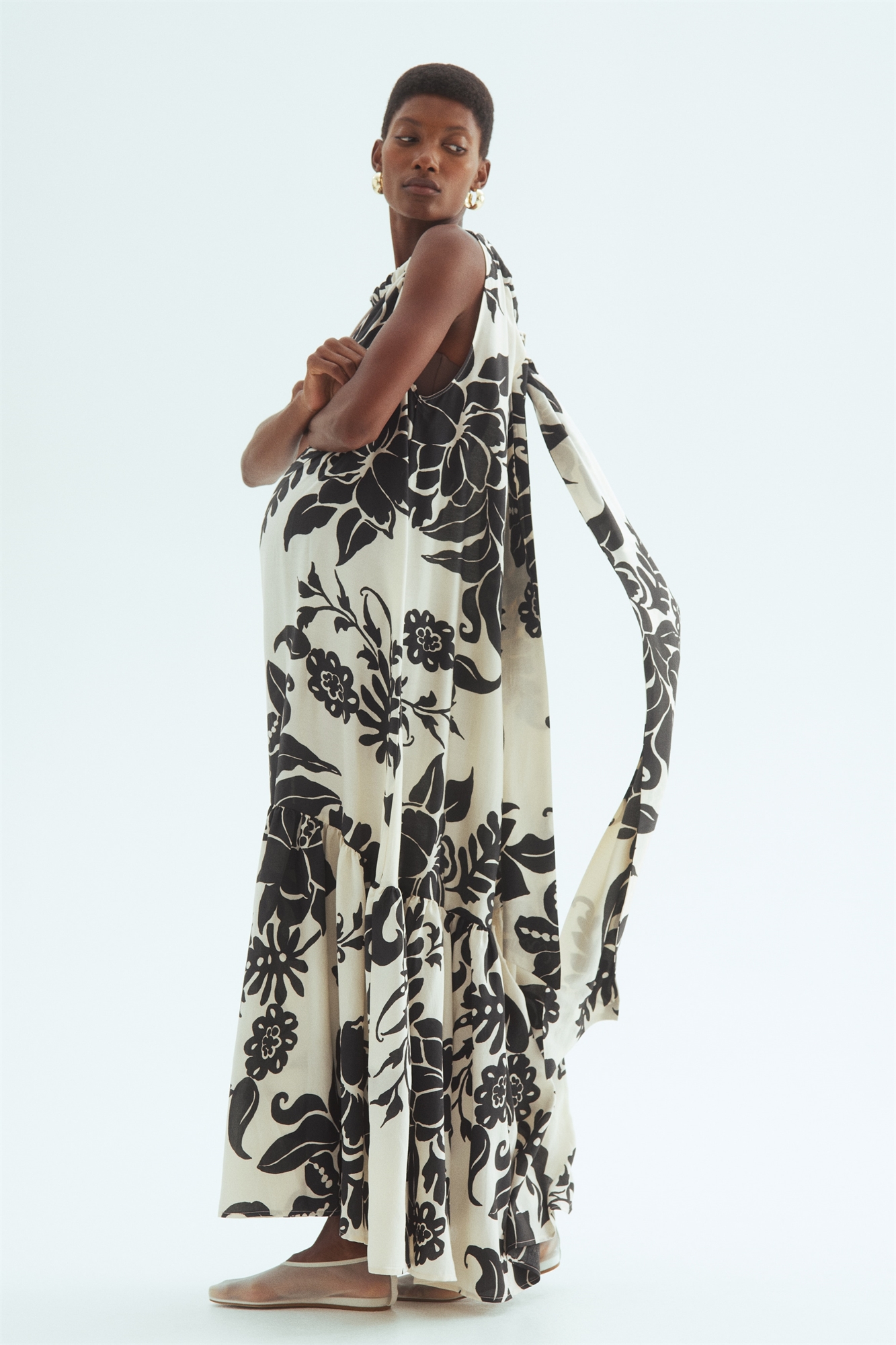 Платье длиной до щиколоток и без рукавов из мягкой ткани с легким блеском. Глубокая пройма сзади и круглый вырез на завязках с широкими струящимися завязками, застегивающимися сзади на шее. Свободный крой с закругленным, собранным ярусом над коленями для придания объемного силуэта. Без подкладки.
